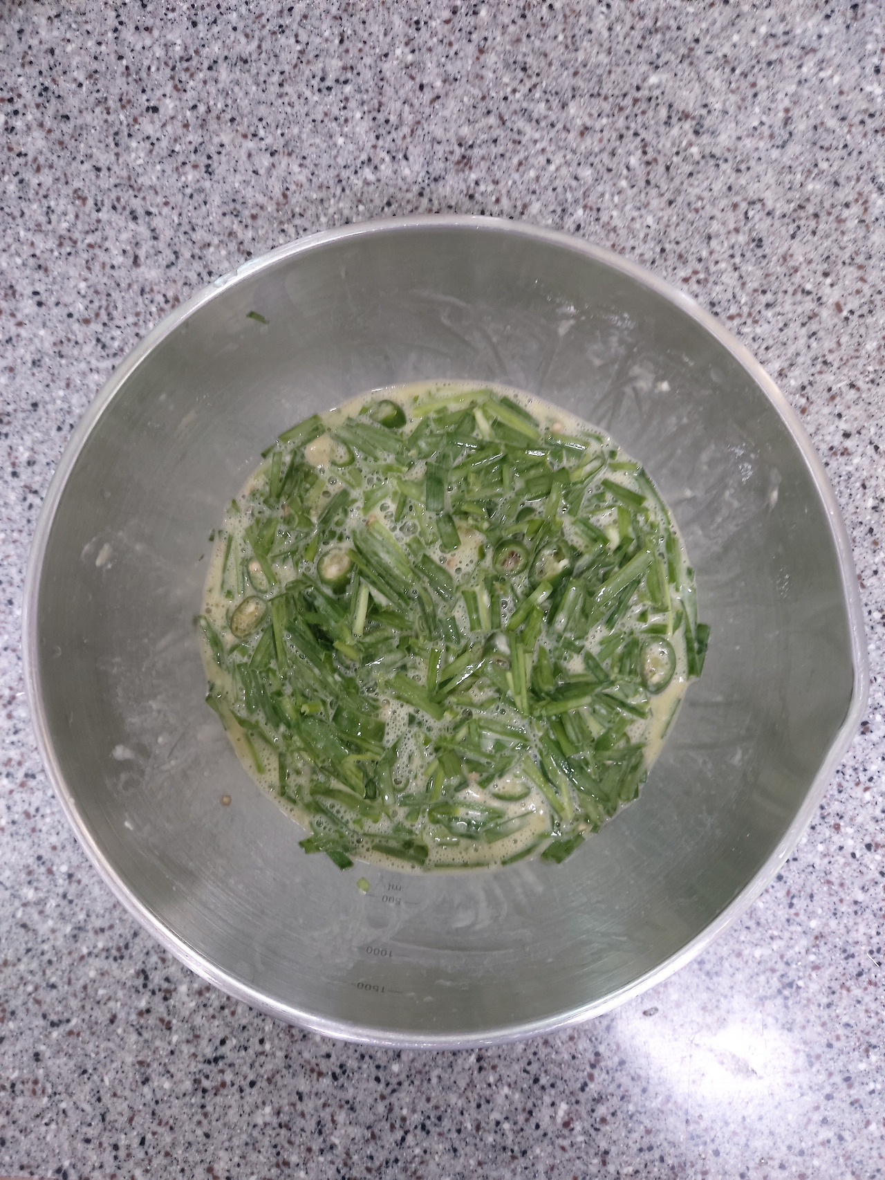 부침가루를 갠 달걀물에 부추와 청양고추를 넣고 섞어준다.