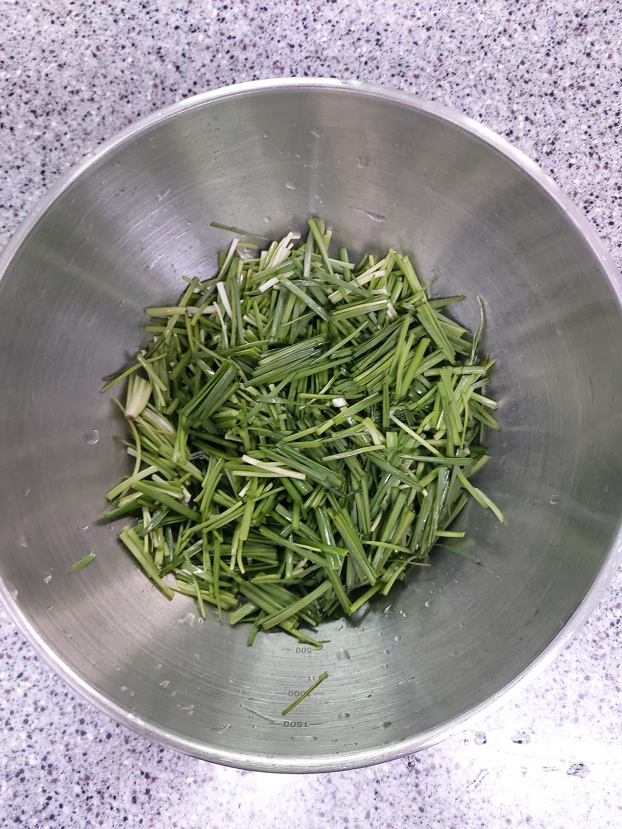 깨끗이 씻은 부추를 손가락 한두 마디 크기로 잘라 볼에 담는다.