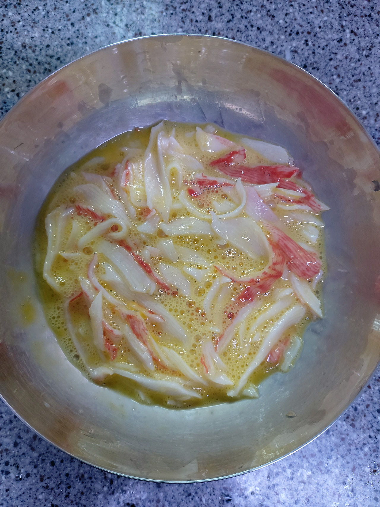 6cm 크기로 자른 게맛살을 결대로 찢어 달걀물을 입힌다.