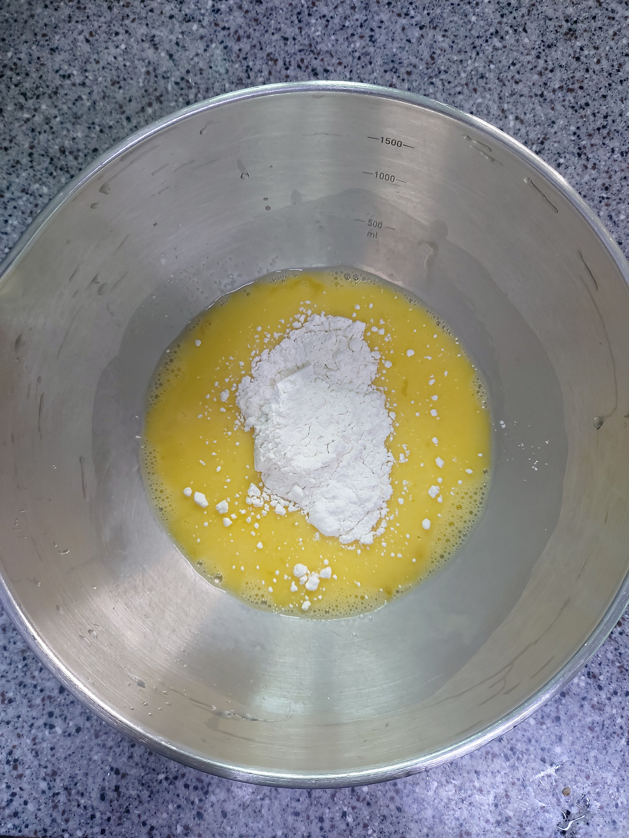 달걀 세 개를 푼 달걀물과 부침가루 한 큰술을 섞는다.