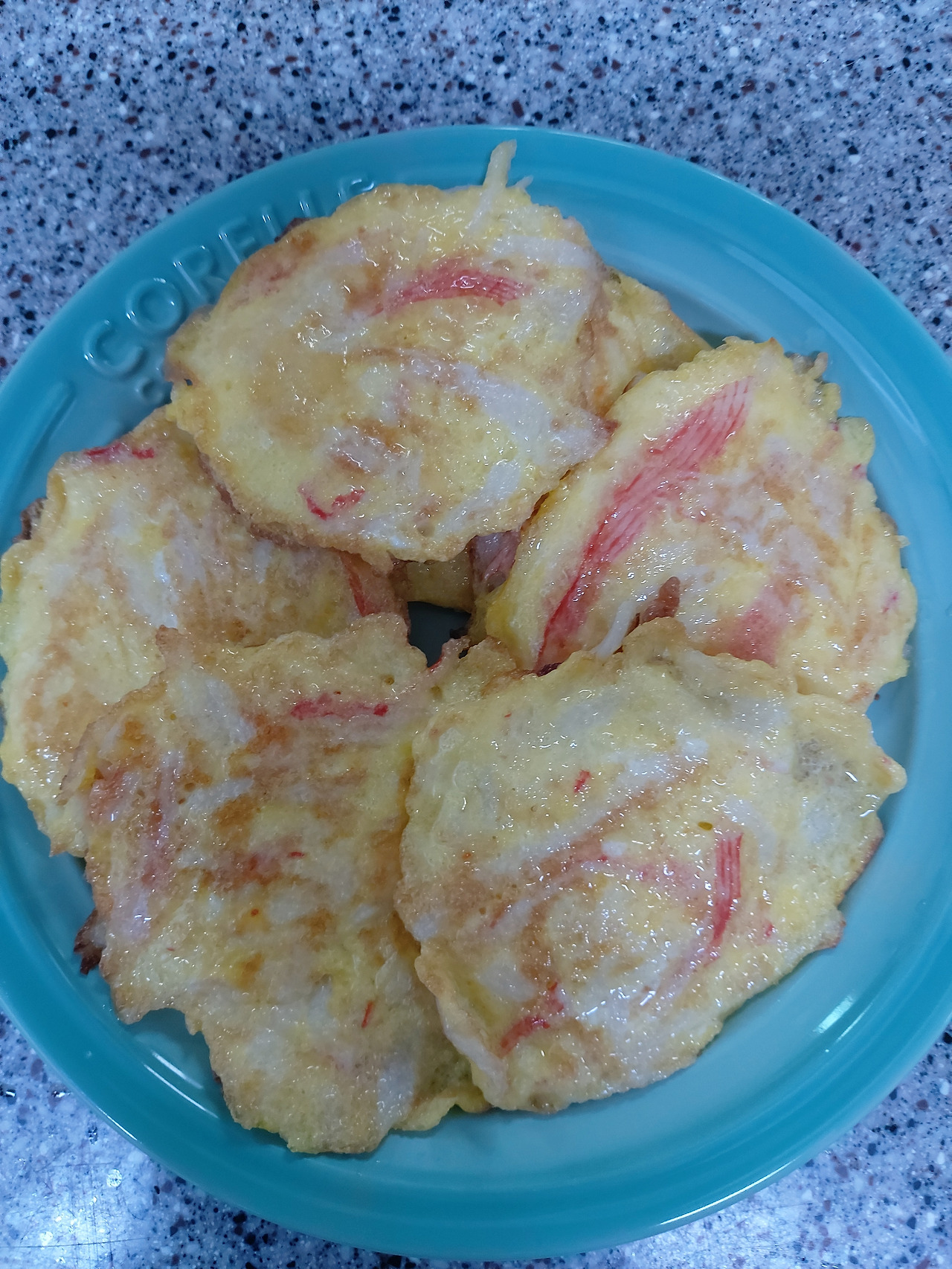나는 게맛살과 달걀물로만 게맛살 전을 부친다. 6cm 크기로 자른 게맛살을 결대로 찢어 달걀 세 개를 푼 달걀물을 입혀 요리하는 간편한 방식이다. 게맛살은 이름처럼 게살로 만든 식품이 아니다. 대구와 같은 흰 살 생선을 가공해 게살의 맛이 나도록 한 것인데 짭조름하면서 쫀득하고 부드러운 맛이 꽤 매력적이다. 게맛살은 생으로 먹어도 맛있어 맥주 안주로도 어울린다.