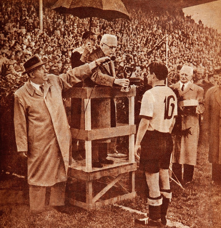 서독 대표팀 주장 프리츠 발터(1920~2002)가 스위스 월드컵 우승 트로피인 줄리메컵을 수상하고 있다. ⓒwikipedia commons, public domain