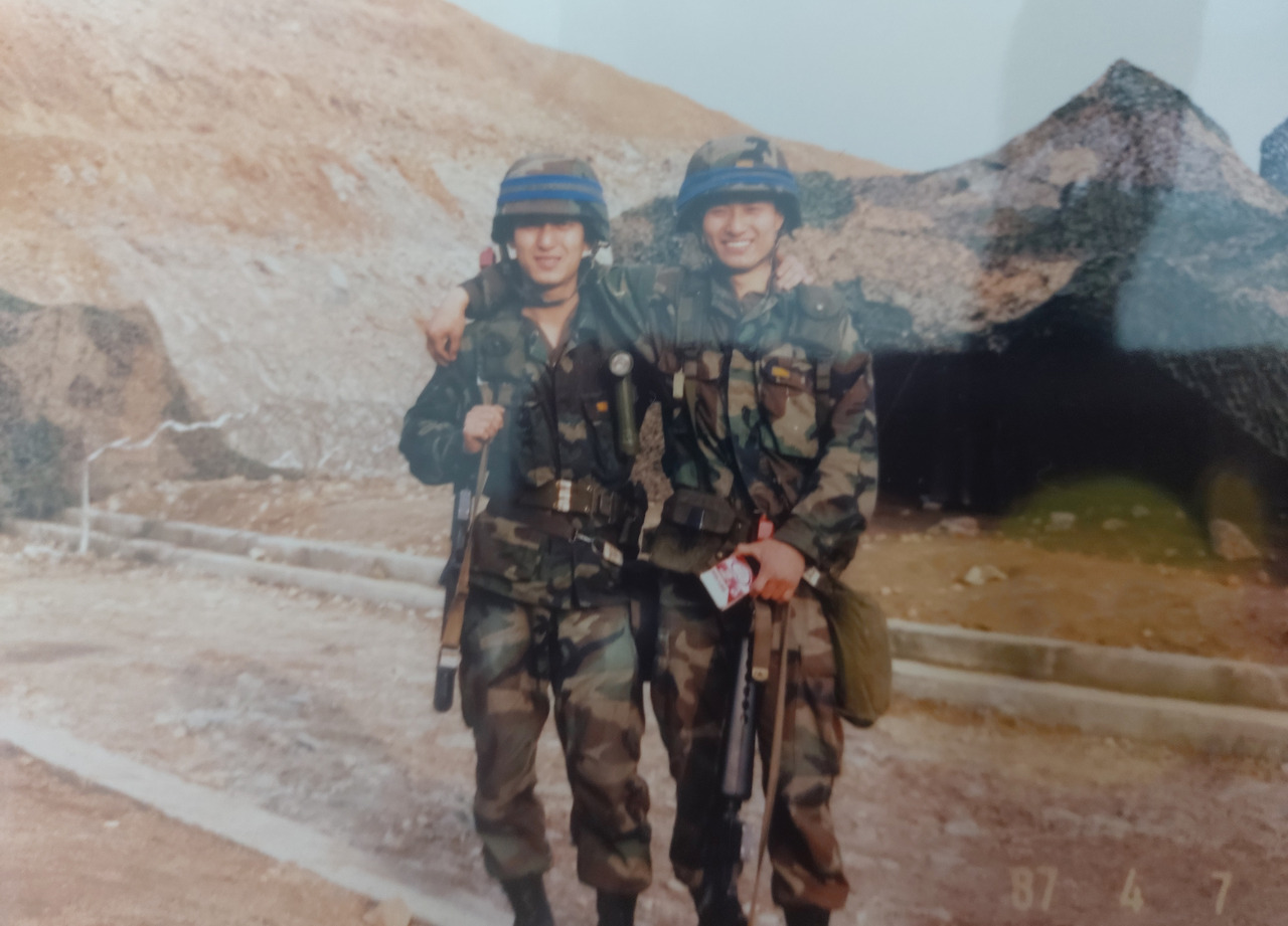 천막 막사 앞에서 중대 후배 카투사와 함께. 왼쪽이 필자.