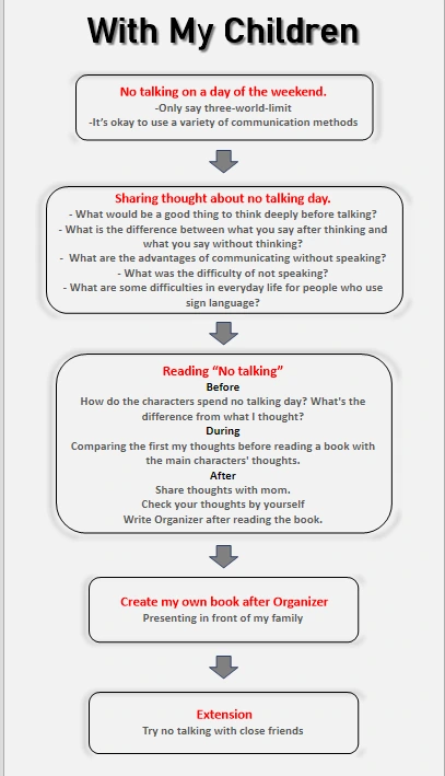 이건 Tesol 과제 중의 하나였는데 제가 No talking이라는 책을 읽고 아이들과 나누고 싶은 질문들을 정리해 본 거였어요.