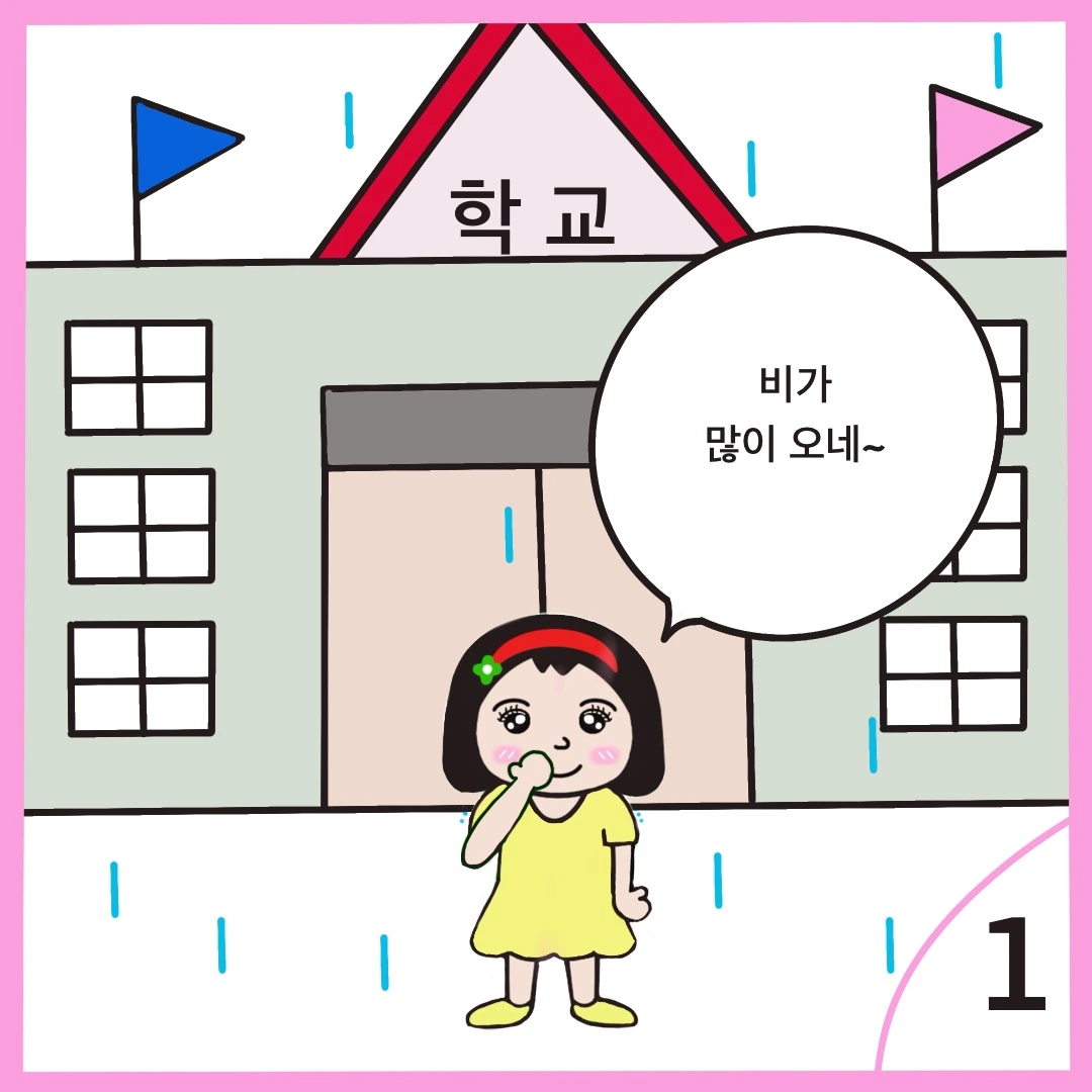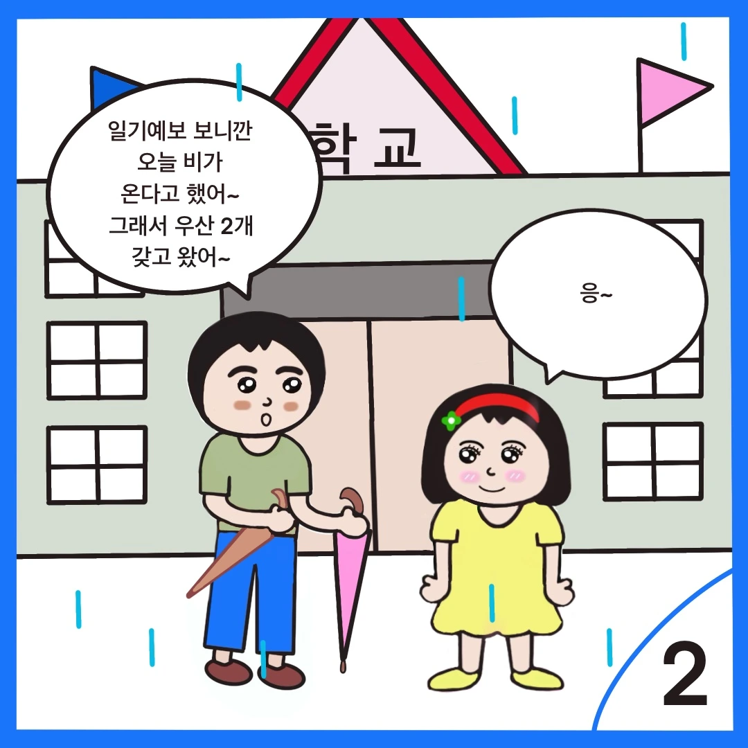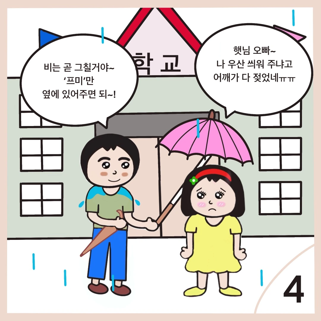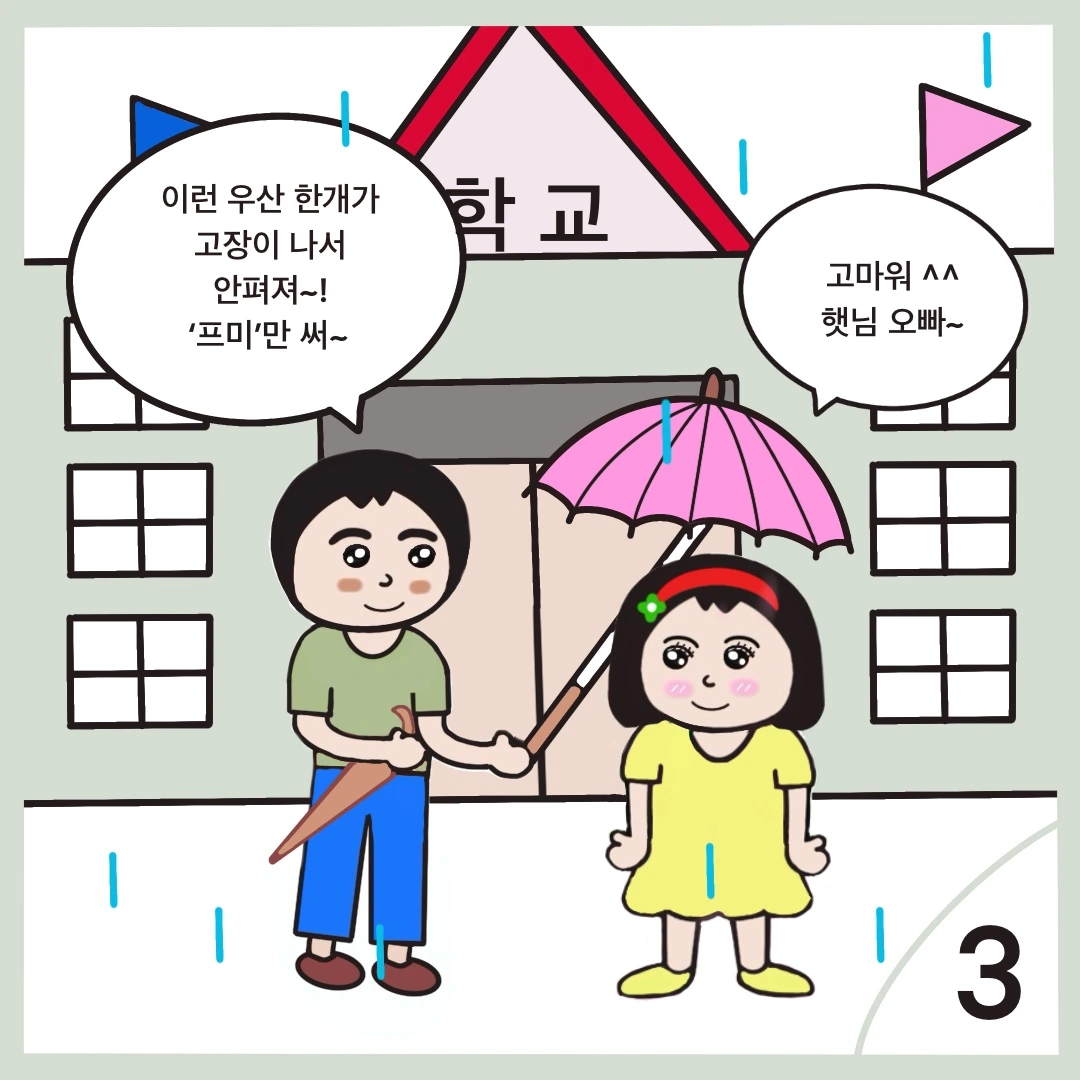 약속시간에 맞춰 학교 앞에 도착한 햇님이는 우산 2개를 준비해 가지고 와 프미에게 말을 건넨다.