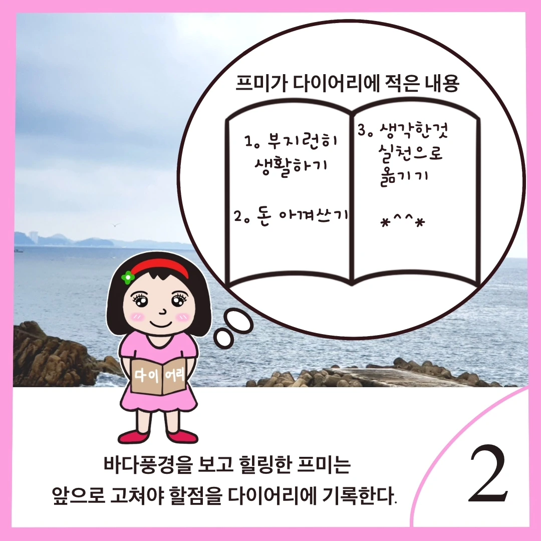 바다풍경을 보고 힐링한 프미는 앞으로의 계획을 다이어리에 기록한다.