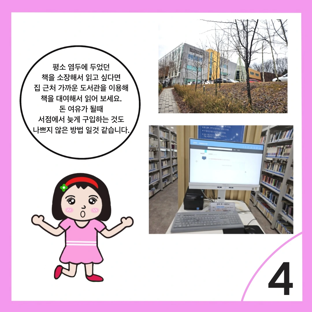 4. 평소 염두에 두었던 책을 소장해서 읽고 싶다면 집 근처 가까운 도서관을 이용해 대여해서 읽어 보세요.