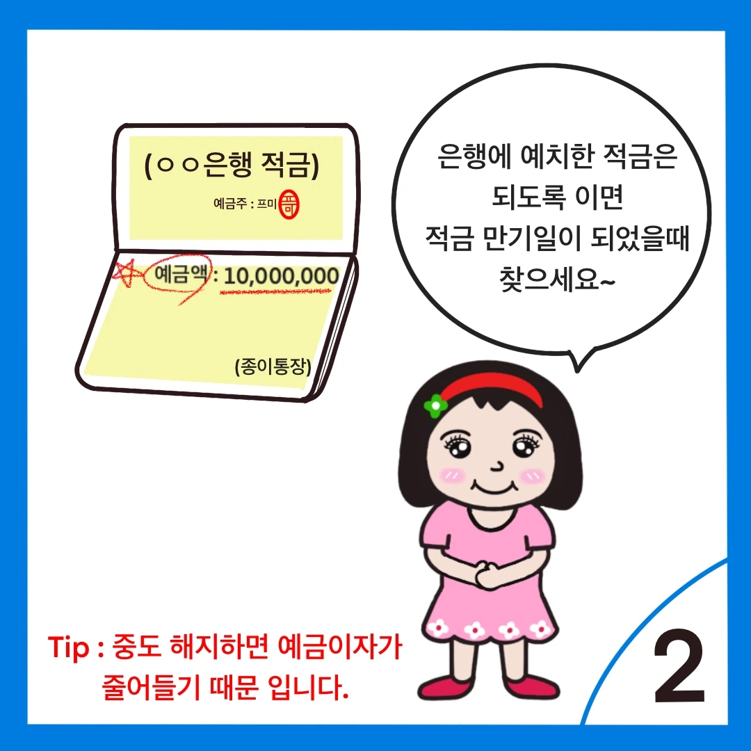 2. 은행에 예치한 적금은 되도록 이면 적금 만기일이 되었을 때 찾으세요.