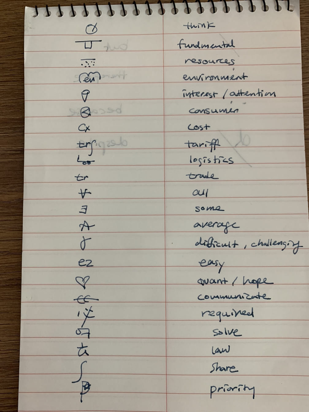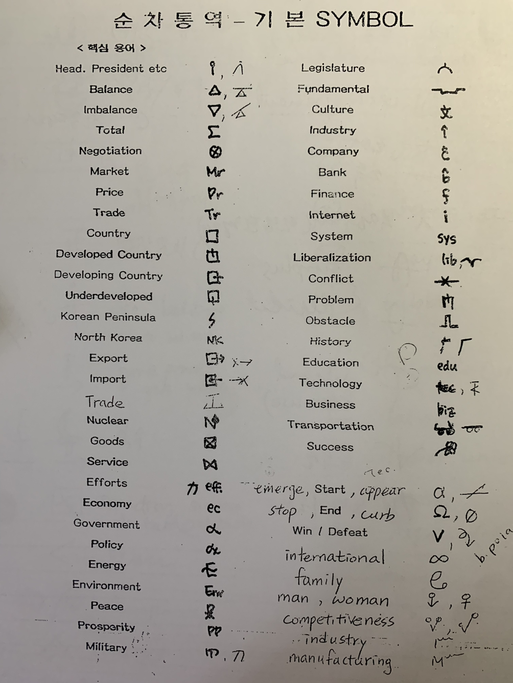 통역사들은 자신만이 알아볼 수 있는 심벌들로 노트를 하는 점도 보통의 노트 작성과 크게 다른 점이다. 물론 통역계에서 널리 활용되는 공통적인 심벌들도 있다. 하지만 상당 부분은 공부하면서, 또 일하면서 스스로에게 잘 맞는 심벌들을 개발하고 몸에 익힌 것들이다.