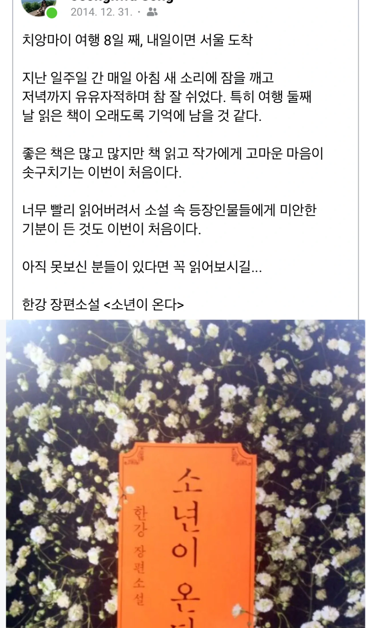 5.18에 제주 4.3까지 연달아 아픈 상처에 대한 작품을 쓴 작가는 앞으로는 "삶의 아름다움"에 대해서 쓰고 싶다고 했었다.
