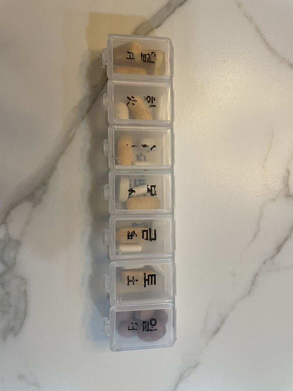 보통 하루 종일 통역하게 되는 출장 중에는 컨디션 관리가 평소보다 더 중요하다. 비타민, 마그네슘 비롯한 영양제도 꼭 챙긴다. 자주 가지고 다녀서 케이스 글자가 많이 지워졌다.