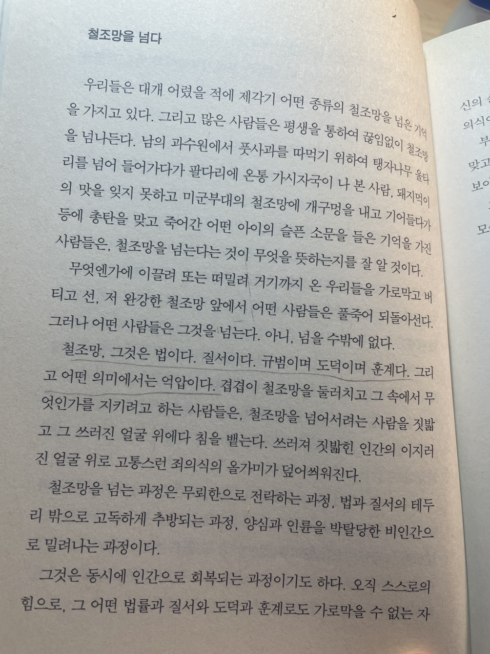 철조망, 그것은 법이다. 질서이다. 규범이며 도덕이며 훈계다. 그리고 어떤 의미에서는 억압이다. 겹겹이 철조망을 둘러치고 그 속에서 무엇인가를 지키려고 하는 사람들은, 철조망을 넘어서려는 사람을 짓밟고 그 쓰러진 얼굴 위에다 침을 뱉는다. 쓰러져 짓밟힌 인간의 이지러진 얼굴 위로 고통스러운 죄의식의 올가미가 덮어씌워진다.