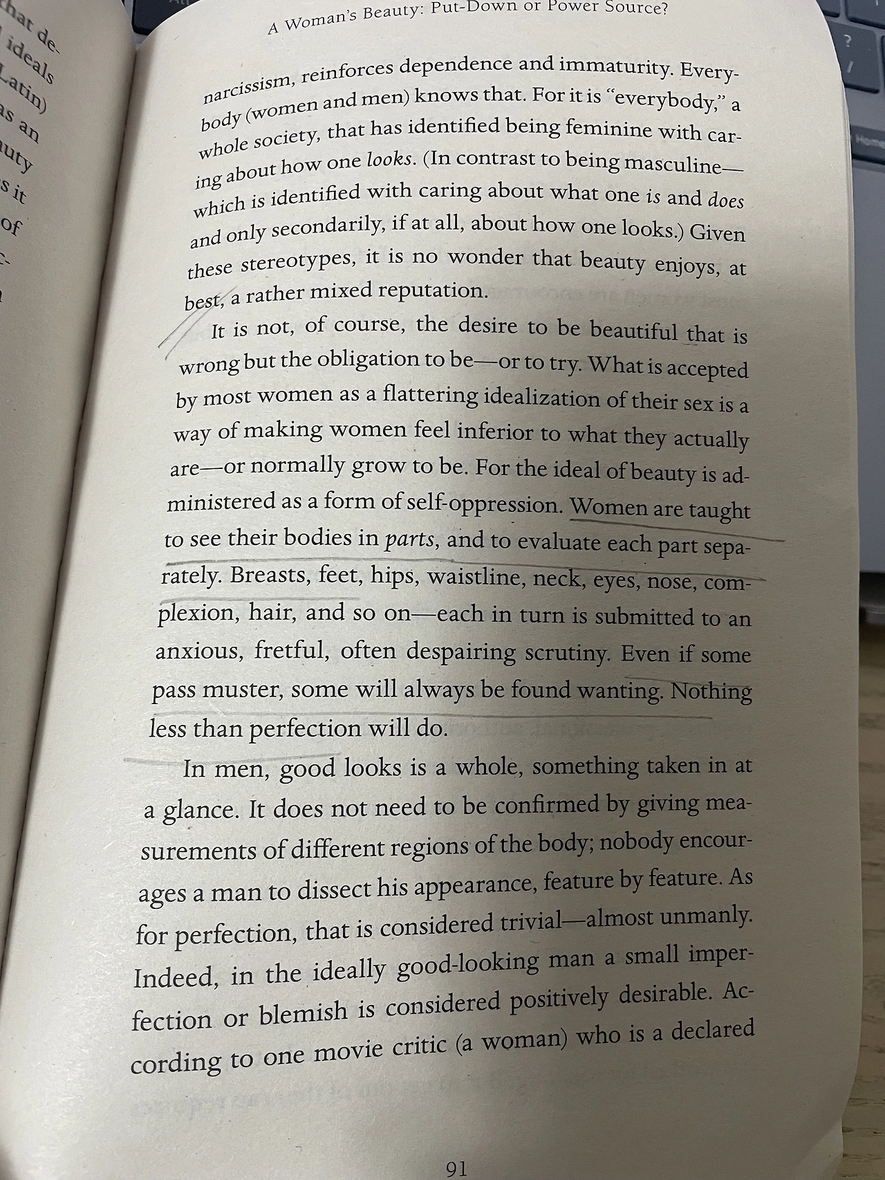 (But to get out of the trap requires that women get some critical distance from that excellence and privilege which is beauty, enogh distance to see how much beauty itself has been abridged in order to prop up the mythology of the "feminine." There should be a way of saving beauty from women-and for them.)
