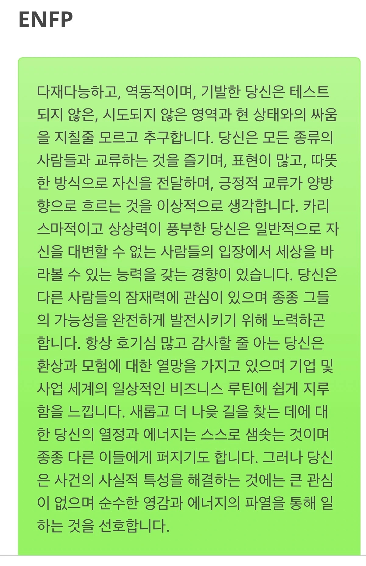 ENFP는 외향적 직관형으로 ‘새로움’, ‘변화와 가능성’에 늘 주의가 쏠려있으면서도 관계 지향적이라 나 뿐만 아니라 나에게 소중한 사람들의 성장과 잠재력 발휘하며 함께 의미있는 삶을 만들고자하는 의지가 충만한 유형이라고 한다.