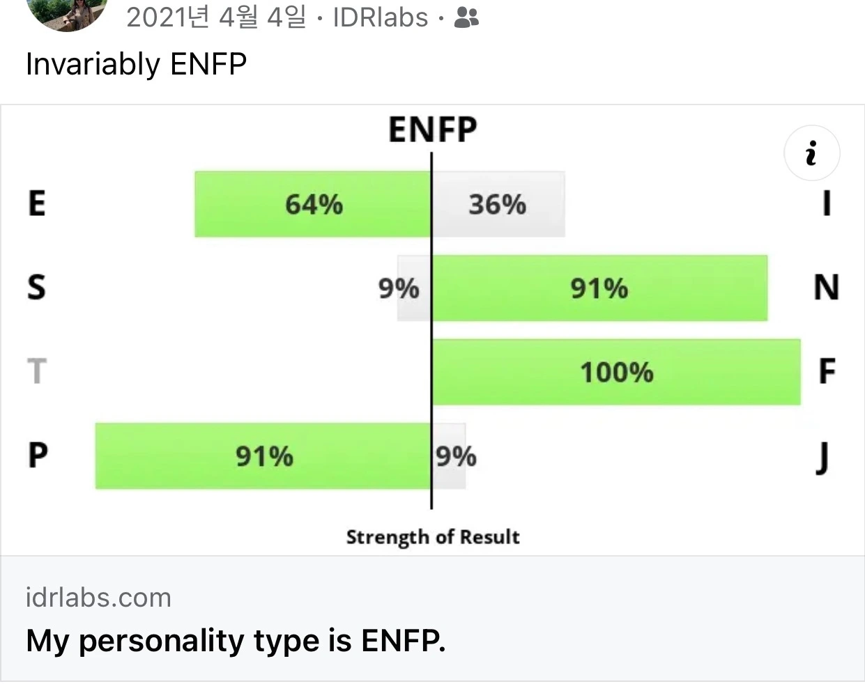 내 경우 매번 ENFP가 나오는데 외향성과 내향성을 나타내는 E와 I의 비율만 6:4 정도고 나머지는 한쪽으로 많이 쏠려있다. 그마저도 19년과 21년 결과를 비교해보니 N과 P 경향이 전보다 더 강해졌다. 참고로 처음에는 국문으로 번역된 문항으로 두번째는 영어 원문 문항으로 테스트했다.