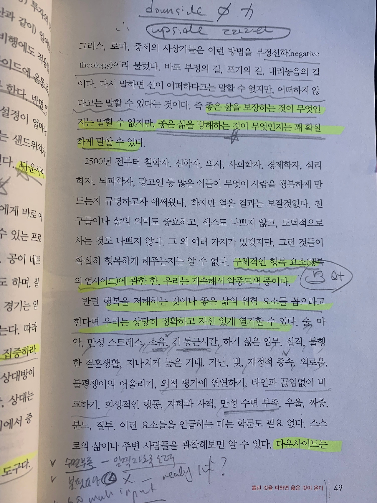 다운사이드는 늘 업사이드 보다 구체적이다. 다운사이드는 화강암처럼 딱딱하고 손에 잡히며, 구체적이다. 반면 업사이드는 공기와 같다. 그러므로 삶에서 되도록 다운사이드 쪽을 체계적으로 제거하는 데 집중하라. 그러면 현실적으로 좋은 삶을 얻게 될 공산이 크다.”