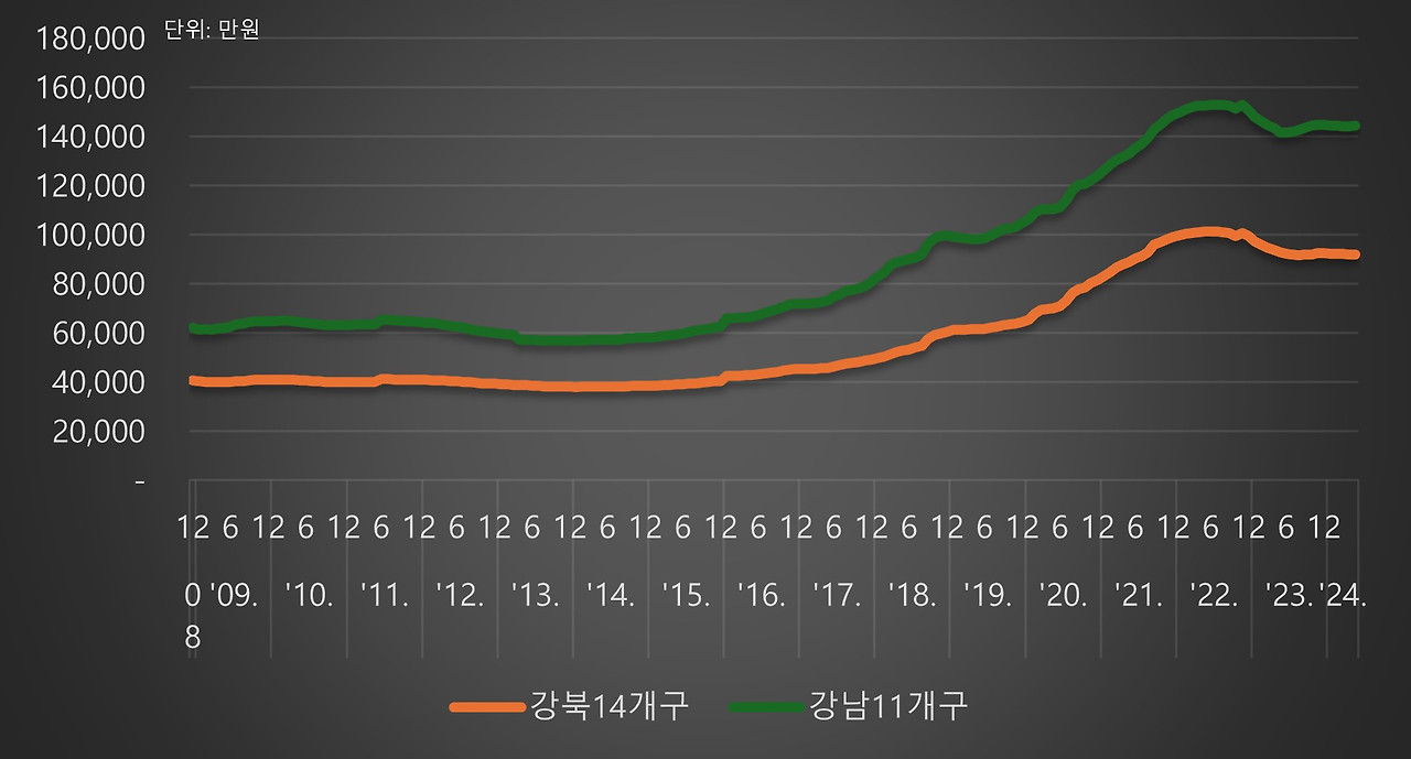 2016년 이후 아파트 가격이 상승하기 시작하면서 강남북간 격차가 커지고 있는 것을 볼 수 있다.