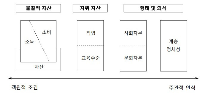한국개발연구원(KDI)의 보고서에서는 다양한 국내외 연구사례를 통해 중산층이라고 인식하게 되는 기준은 물질적 자산을 비롯한 객관적 조건 이외에도 주관적으로 직업, 교육 수준 등 지위 자산과 사회자본, 문화자본, 계층 정체성 등의 행태 및 의식과 같은 주관적 인식을 포함한 넓은 스펙트럼에서 인식하고 있다고 소개하고 있다.