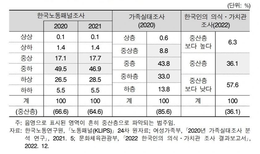 출처 : KDI '한국의 중산층은 누구인가' 시사인 재구성아래 표는 정부 부처에서 정기적으로 조사하고 있는 조사결과에서 나타난 주관적 계층의식 조사결과이다.