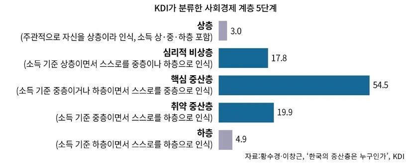 객관적 기준과 주관적 인식의 차이에 의해서 아래의 그림과 같이 한국의 중산층은 아래와 같이 세 개의 계층으로 나누고 있으며 '심리적 비상층'과 '취약 중산층'과 같이 스스로 소득 기준보다 낮추어 인식하는 경우가 약 37.7%를 차지하고 있다.