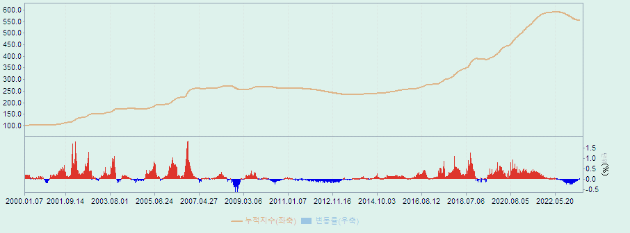 그래프에서 보면 빨간색의 상승 변동이 파란색의 하락 변동보다 훨씬 많은 기간에 분포해 있었고 더욱 뾰족했다. 그리고 최근 몇 년간 유래 없이 가파른 상승을 보였고 하락의 기울기도 컸다.