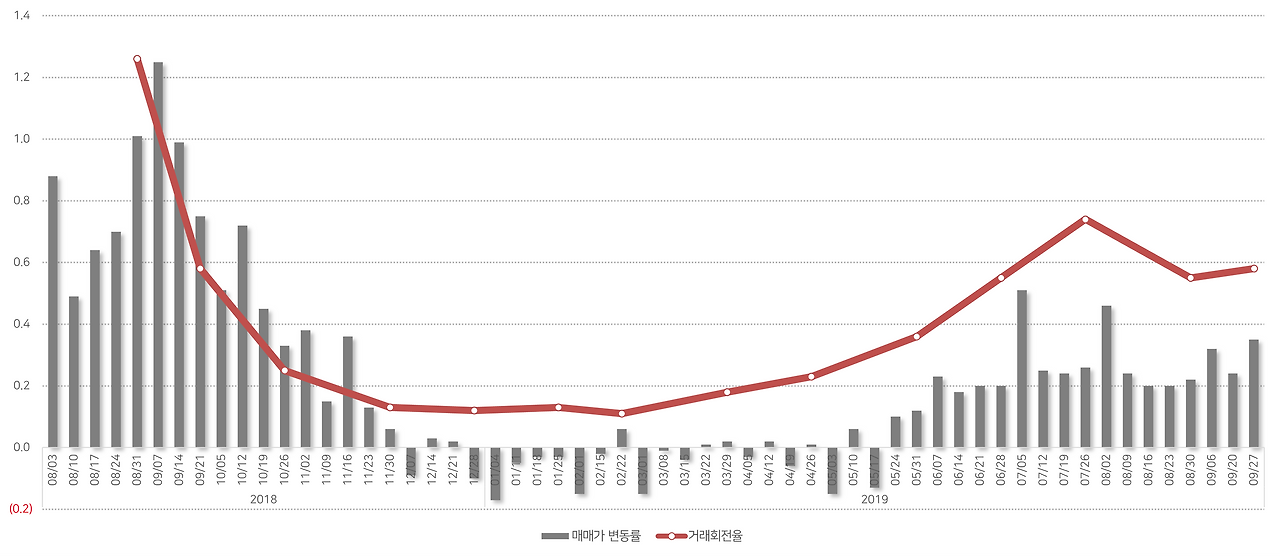 과거(2018~2019) 서울 아파트 매매가 변동률 및 거래 회전율(한국부동산원, 부동산R114 자료 가공)
