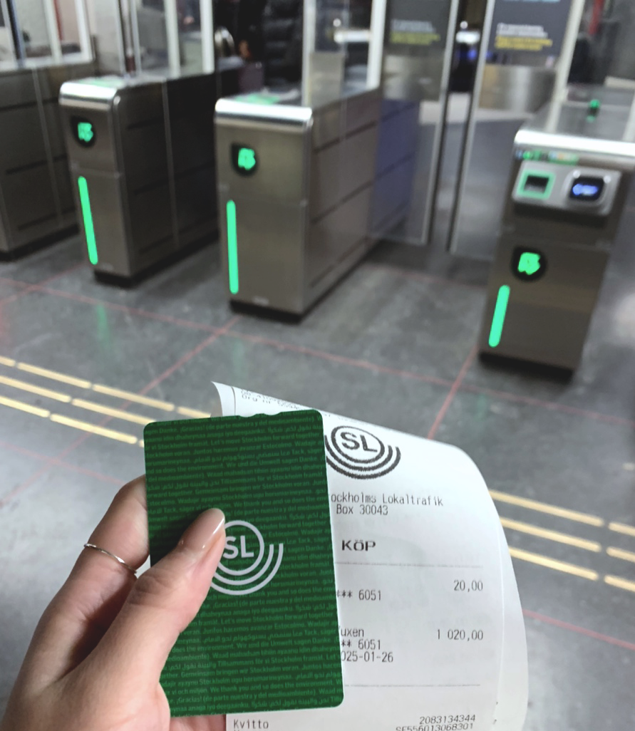 티켓 구매할 때 (75분, 24시간권, 72시간권, 1년 정기권) 선택할 수 있고 가격이 각각 다르니 유의하여야 한다. 이 교통권 이용을 위해서는 SL 어플을 다운로드 한 후 활성화를 해야 한다.