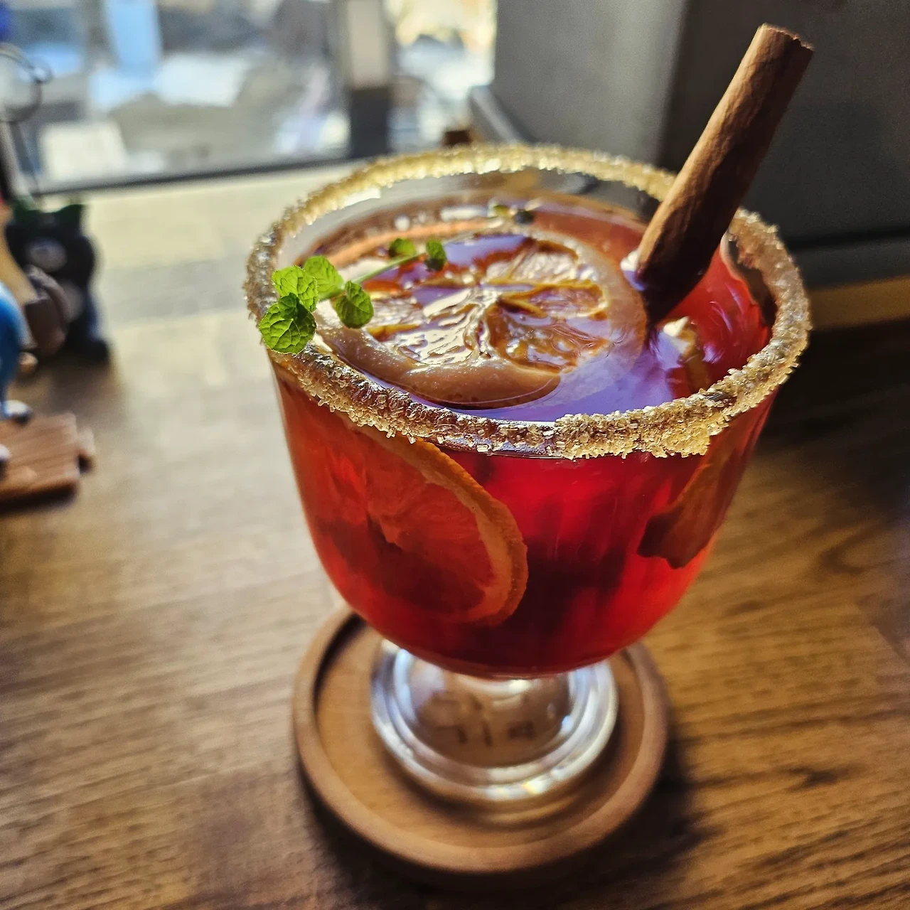 시나몬 진저자몽차: 마당에 주렁주렁 열린 미니사과를 가을에 따서는 꼬마 단골들 손에 쥐어 주고 남은 것들을 잘라서 사과청을 담아 놓는다. 그리고 생강, 자몽, 히비스커스등의 맛을 추가해 본다. 계피설탕을 두른 잔에 슬라이스 된 오렌지조각과 허브로 멋을 내어서, 시나몬 스틱을 꽂아 저어 드시는 용도로 제공한다. 시나몬은 시간이 흐를수록 맛이 깊어진다. 뜨거운 물에 한 번 더 드셔보라고 권한다.