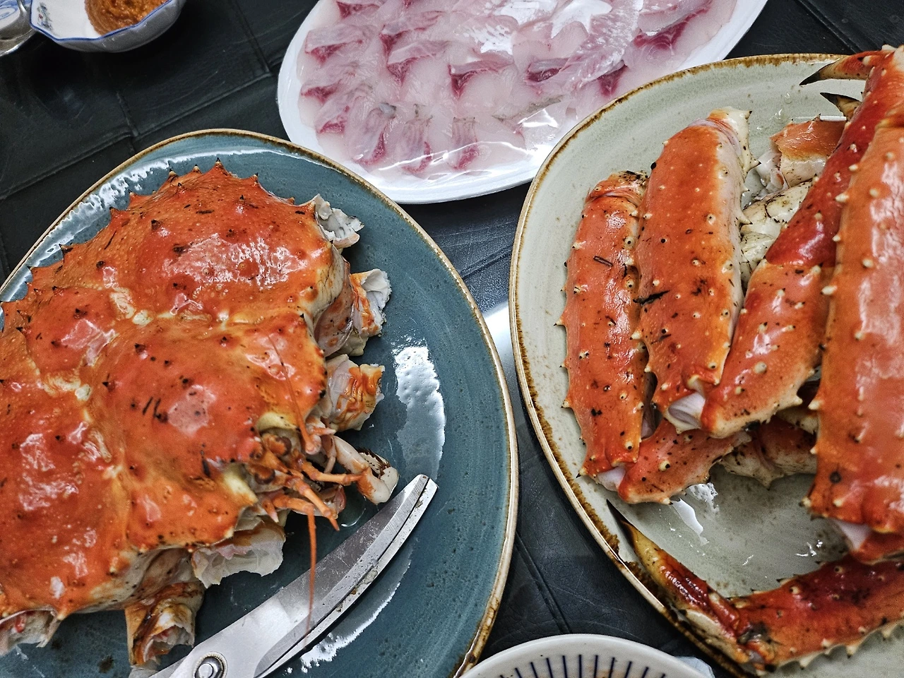풍성한 한상이 차려졌다. 어머님표 붕어찜과 갈비, 갖은 밑반찬 그리고 현지 공수한 회... 그리고 게였다.