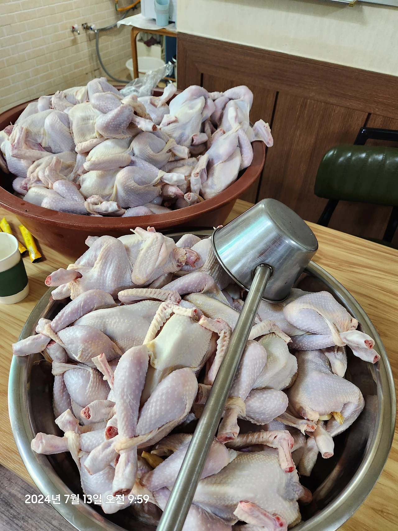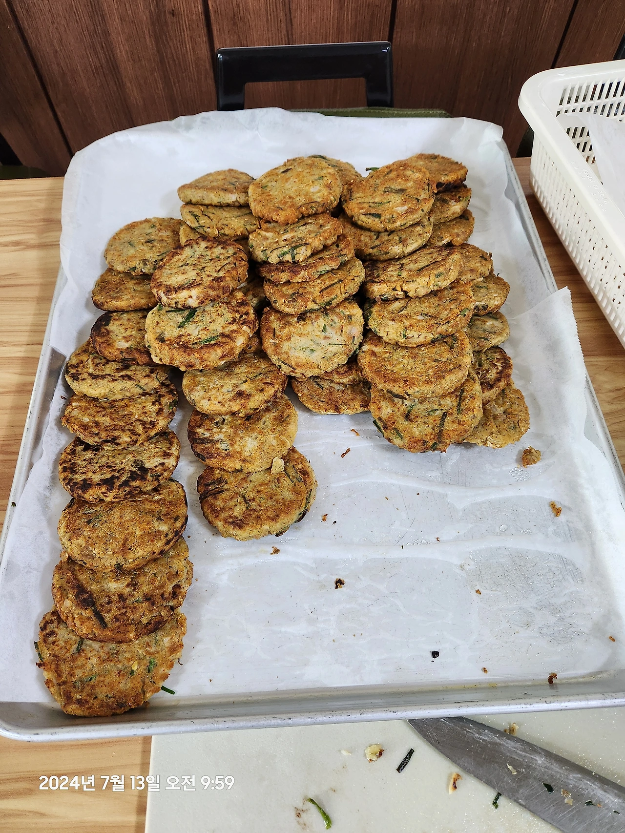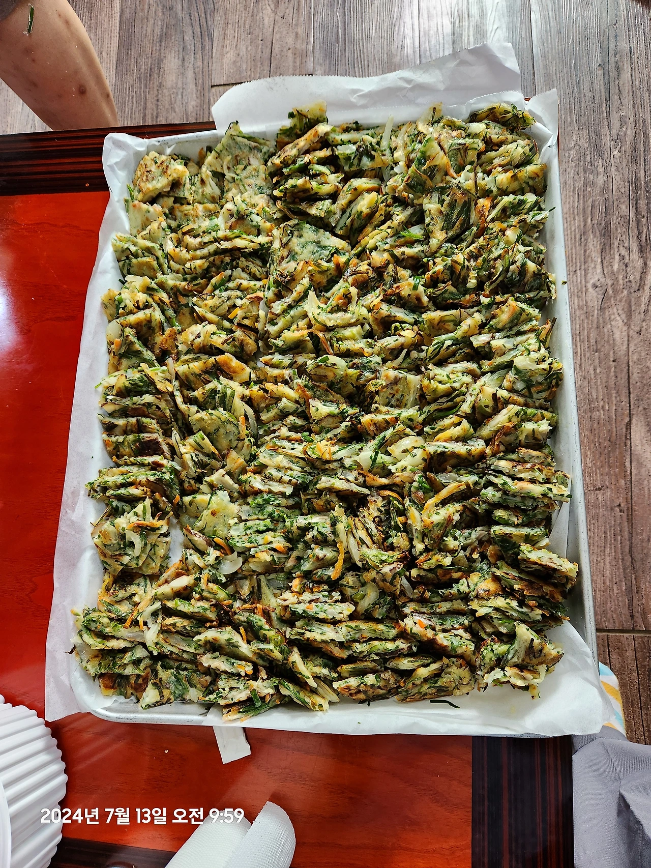 다음날, 나는 녹두전팀에 배속되었다. 커다란 대야 속에는 녹두와 각종 재료가 섞인 반죽이 가득 들어 있다. 야채 전팀은 이미 시작이 되었다. 양옆에서 배틀이라도 하듯 뒤지개와 국자가 쉴 새 없다.