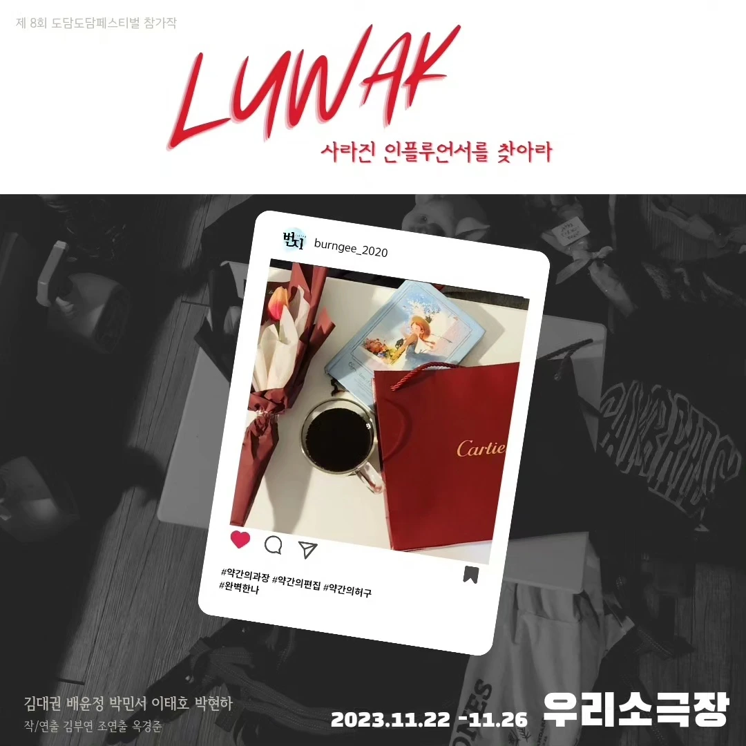첫째 딸 김부연은 배우면서 연출가이다. 제8회 도담 페스티벌 출품작을 무대에 올린다고 한다. 시나리오를 직접 쓰고 연출까지 담당하고 있다. 작품제목이 '루왁'이란다. 의도가 궁금했다.