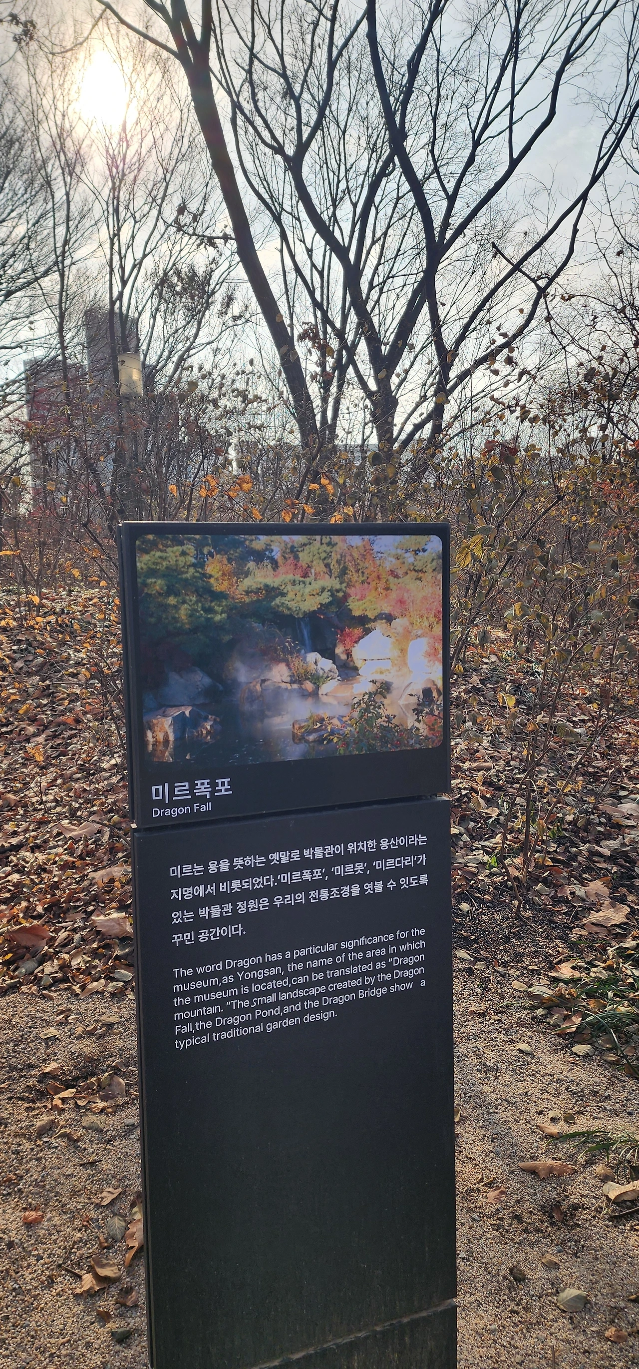 보신각종 옆으로 언덕을 오른 뒤 용산가족공원의 뒷마당을 향했다. 넓은 잔디밭에는 사진에 잘 나오는 나무와 조각품이 있다. 일몰과 어우러진 시간에는 더 좋다. 다시 언덕을 오르면 태극기공원이 있고 앞쪽으로 내려가면 장미원이 있다. 용산가족공원의 연못 주위를 걷고 다시 국립중앙박물관으로 향하면 미르폭포가 있다. 조용히 쉴 수 있는 공간이다. 오늘은 물안개가 없어 아쉬웠다. 국립한글박물관 옆에 있는 석조물정원에 도착하여 석탑을 구경했다. 전국에서 모인 석탑이 모여있으며 국립중앙박물관의 색다른 공간이다. 석탑을 구경하고 바로 옆의 청자정이 있는 거을못을 둘러보았다. 국립중앙박물관 조망지점에서 국립중앙박물관 전체를 사진 찍었다. 언제나 멋진 사진이 찍힌다. 다시 대나무가 있는 계단을 올라 국립중앙박물관에 입장헸다.