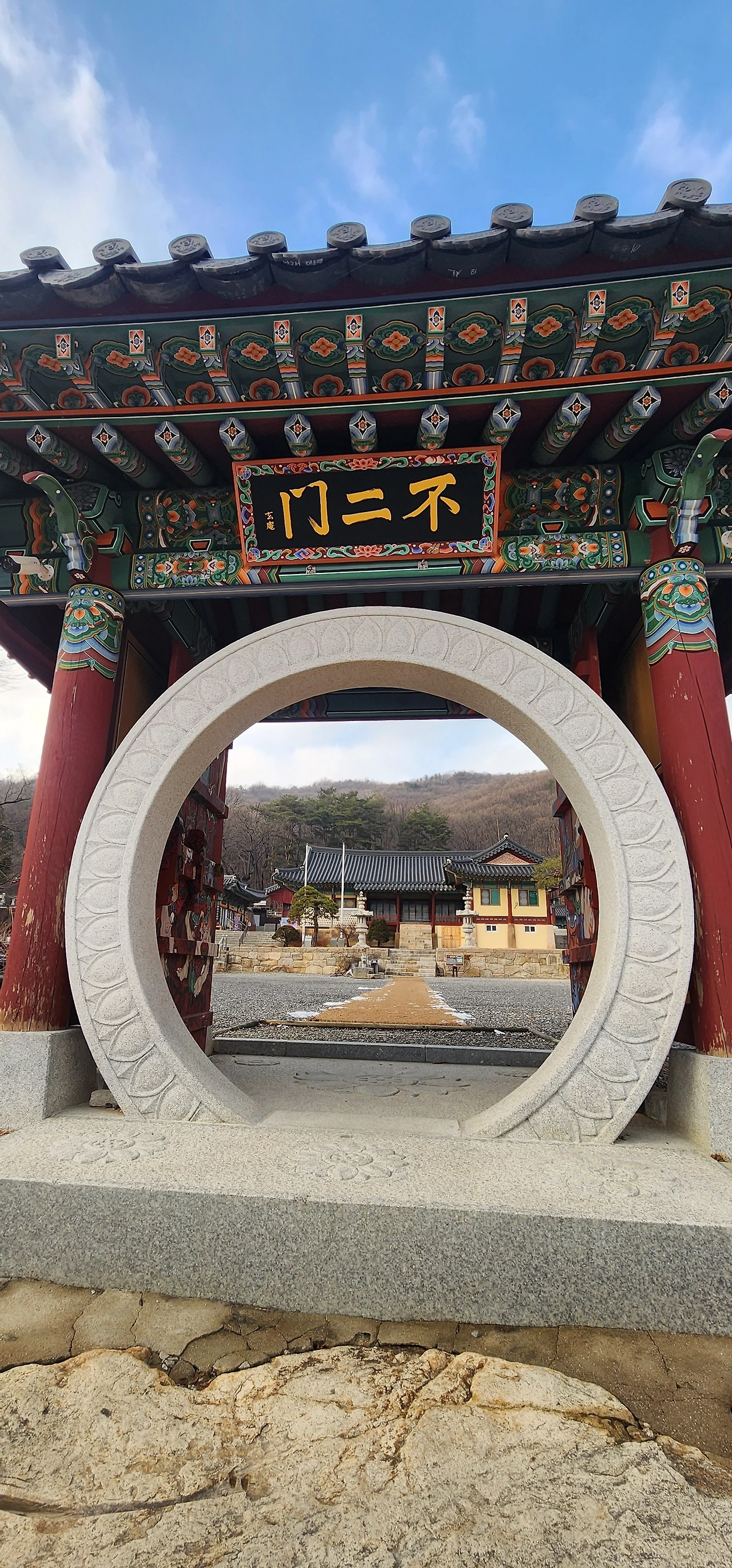 흥국사 입구에는 흥국사라고 쓰인 일주문이 있다. 불이문 오르는 계단의 중간쯤에 만일회비 비석이 있다. 일주문에서 약사전 방향을 바라보면 불이문으로 오르는 인상적인 계단이 멋지다. 불이란 모든 존재와 현상이 본질적으로 하나임을 강조하는 사상이다. 불이문 뒷편에는 해탈문이라 쓰여있다. 해탈문(解脫門)은 모든 번뇌와 속박에서 벗어나 깨달음의 세계로 들어가는 문으로 불이문과 같은 의미라 한다.