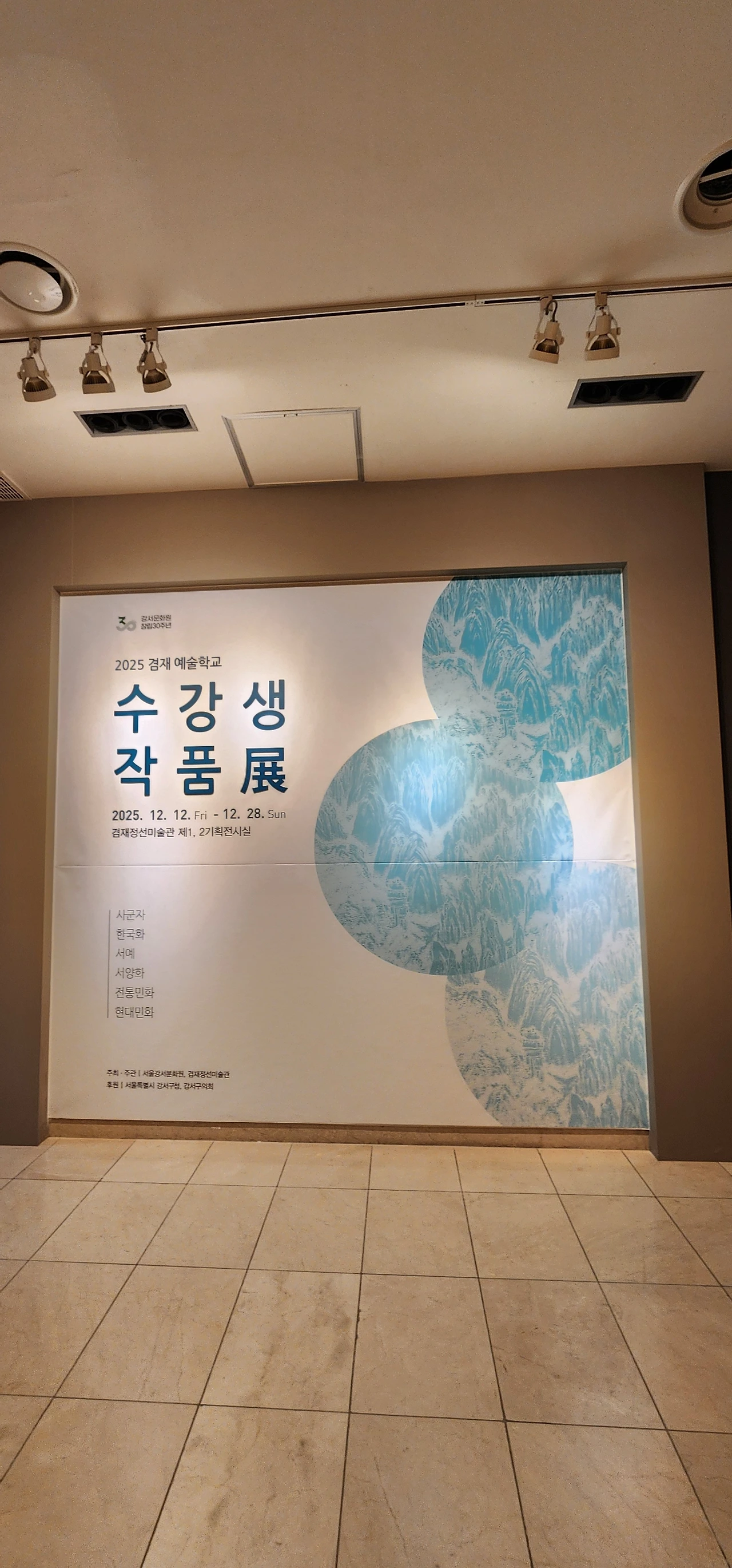 겸재정선미술관은 궁산땅굴 앞에서 보이는 도로 옆이 3층이다. 예전에는 도로 옆 3층이 입구이고 전시장이라고 기억하는 데 리번에는 건물옆 계단으로 일층까지 내려오란다. 나중에 물어보니 얼마 전에 내부공사가 있었다 한다. 일층에서 미술관에 입장하니 입장료 1000원을 내라 한다. 우산을 던져두고 입장하니 미술관의 수강생들의 작품전이 진행 중이다. 수강생들의 작품이 멋지다. 나에게는 모두 훌륭한 작품으로 보인다