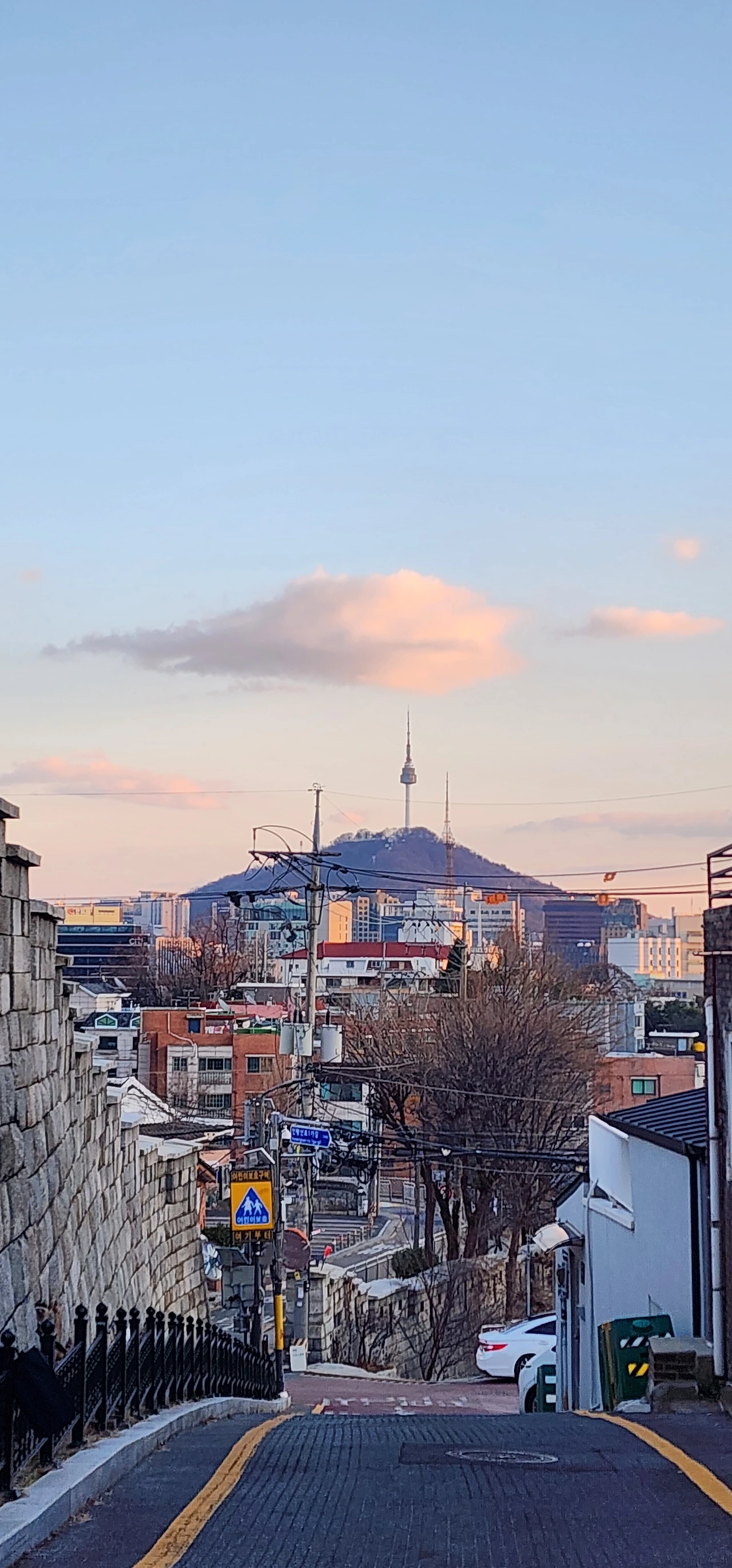 홍난파가옥에서 사진 한 장 찍고 뒤로 보이는 인왕산을 보면서 앞으로 걸으면 사직터널 위를 지난다. 능라도라는 북한음식점이 있고 페르시아어로 '기쁜마음' 이라는 의미의 예쁜 빨간 벽돌의 딜쿠샤가 나타난다. 선교사 알버트 테일러가 살던 집이다. 집 앞의 큰 나무는 부근에는 권율도원수 집터가 있다. 돌아서서 이제 인왕산공원 입구까지 골목을 지나는데 마침 저녁노을이 멋지다.