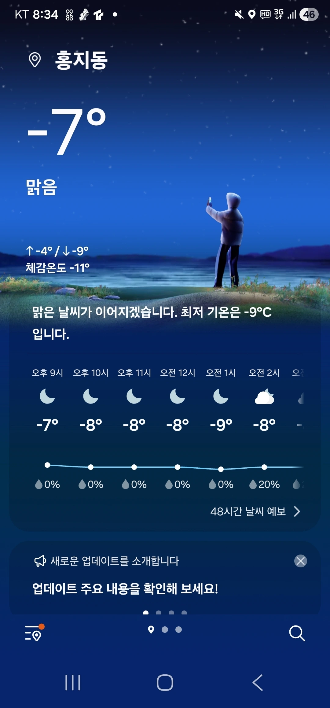 일일만보가 필요할 때 집 앞의 상명대 운동장은 유용하다. 단단히 준비하고 운동장에 나섰다. 상명대 운동장에서는 북한산, 북악산, 인왕산 그리고 멀리 안산도 보인다. 멀리 남산 그리고 부암동과 홍지동의 불빛은 홍지문과 어우러져 조용한 서울을 보여준다. 그런데, 아뿔싸 영하 7도, 체감온도 영하 11도다.