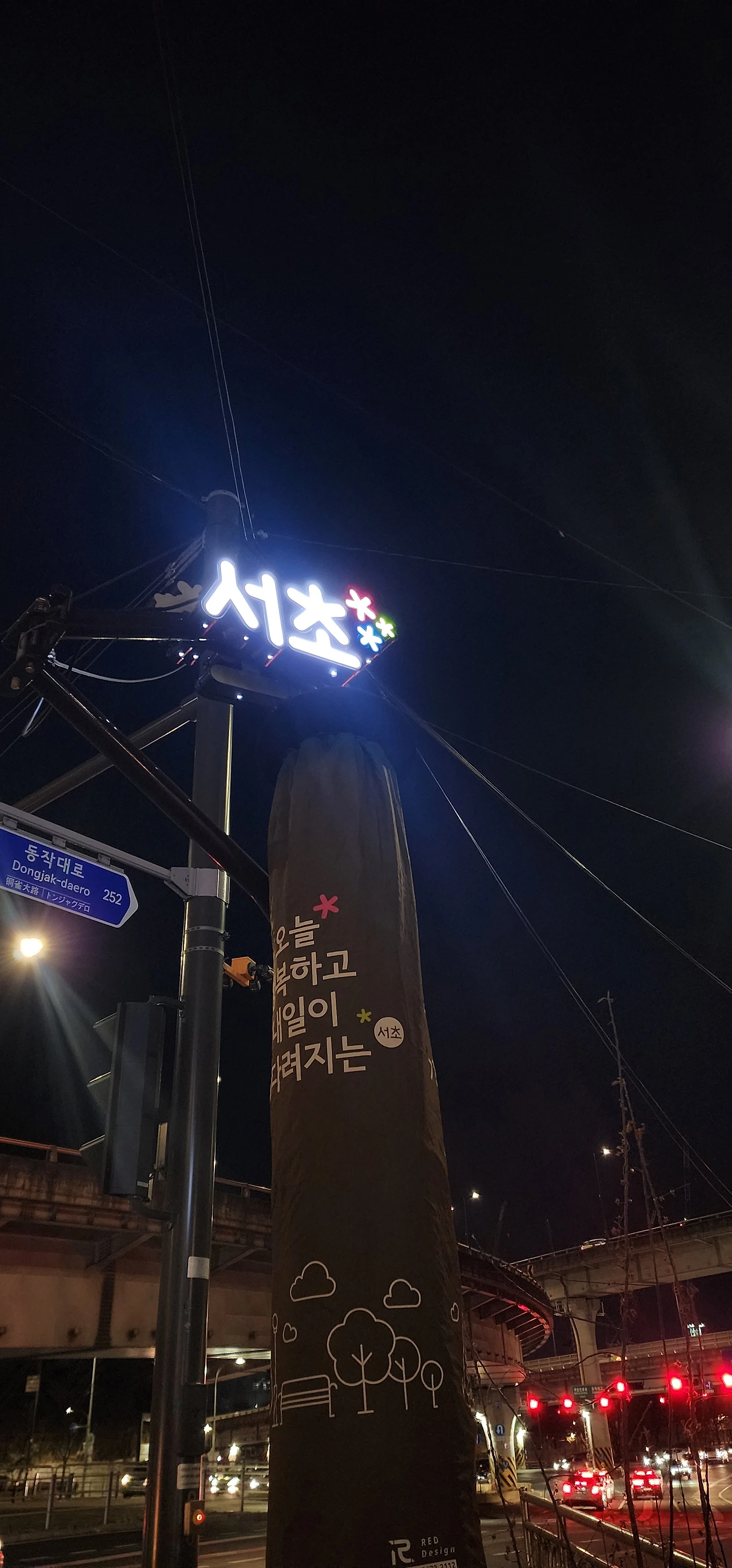 물도 없는 인공폭포를 보고 횡단보도를 건너니 서초가라고 반긴다. '오늘 행복하고 내일이 기다려지는 서초구'라 쓰여 있다.