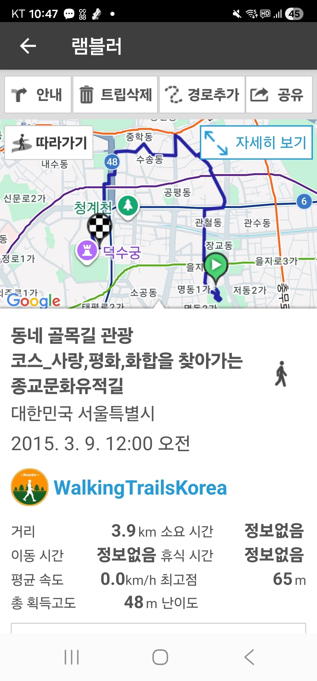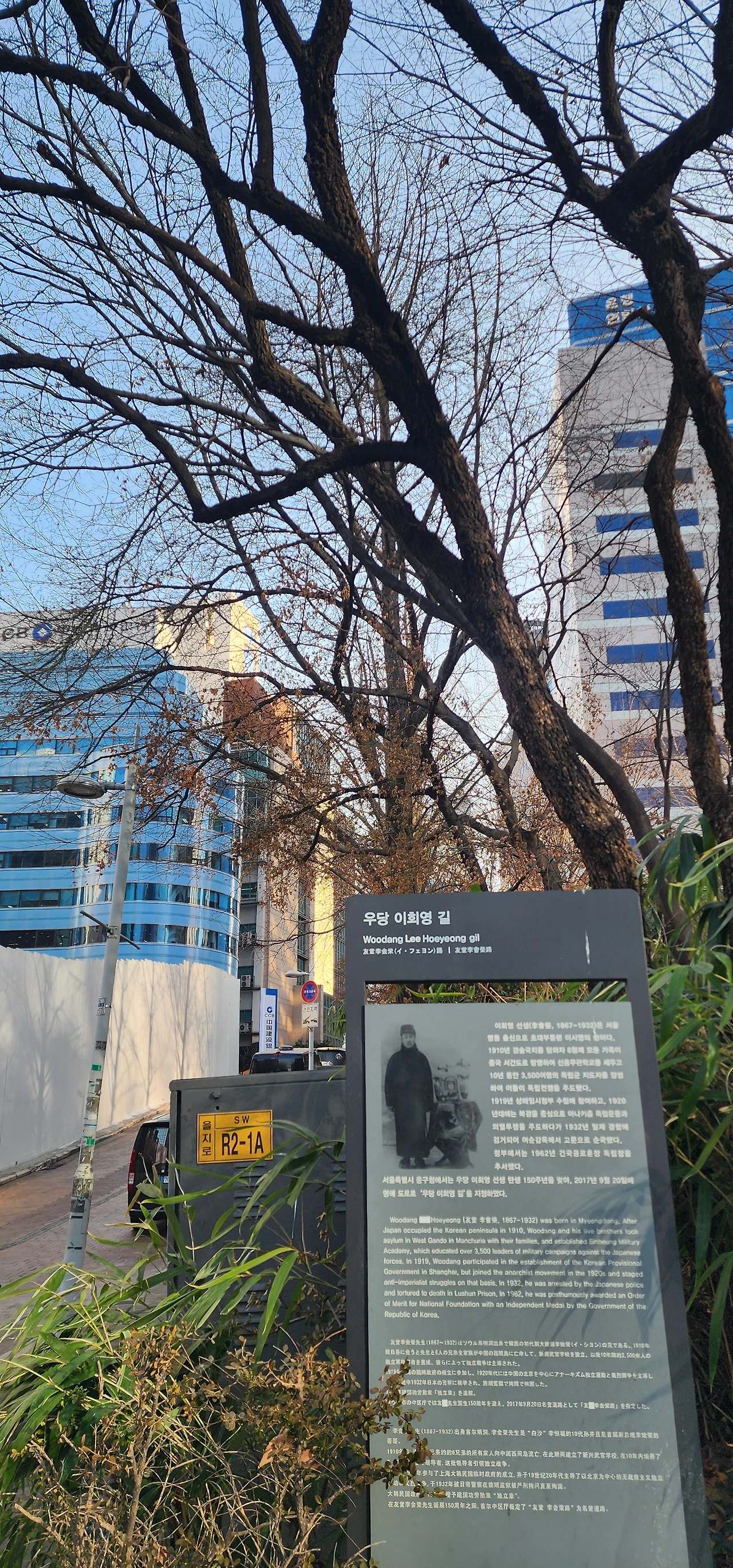 골목을 지나 조계사 대웅전 뒤를 지나면 아기동자와 저만치 석탑이 보인다. 왼쪽 앞으로 우정총국인데 공사 중인지 가림막이 있다. 멀리 열린송현녹지광장을 바라보며 인사동을 찾는다. 인사동 입구의 커다란 붓 모양의 조형물을 지나 '안녕 인사동'이라 쓰인 정자를 지난다. 절반쯤 걷다가 천도교 중앙대교당을 다녀온다. 인사동을 벗어나려니 낙원상가, 탑골공원이 보고 나서야 종로에 들어선다. 종로의 '젊음의 거리'를 관통하여 청계천을 지나 한빛공원을 지나면 을지로로 들어선다. 외환은행 본점으로 기억하는 하나은행 건물 왼편에 '우당 이회영 길'이 있다. 우당기념관은 서촌에 있다. 좁은 골목을 걸어 명동성당에 도착한다.