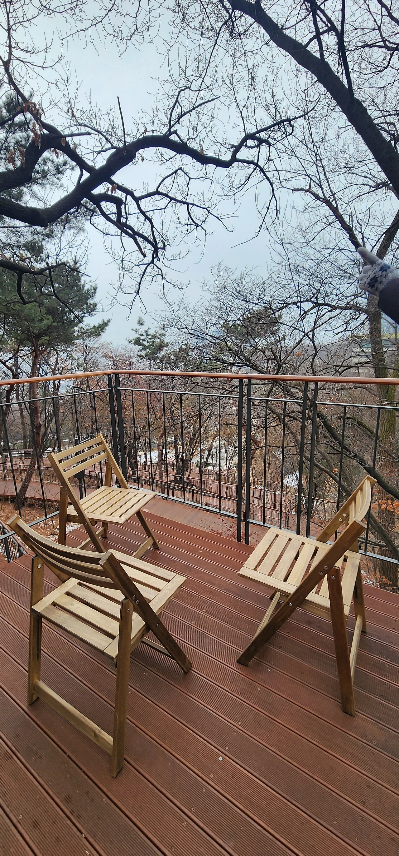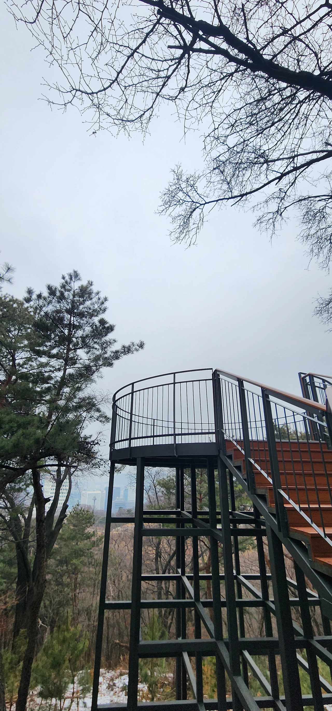 남산도서관 입구 부근에서 목표인 남산 하늘숲길 앞에 도착하여 잘 조성된 데크를 걷기 시작했다. 몇 달 전에 개방했기 때문에 마치 얼마 전 입주한 집처럼, 새로운 길의 느낌을 팍팍 주었다. 남산 하늘숲길은 무장애길이지만 중간중간 계단으로 전망대가 연결되어 있다.