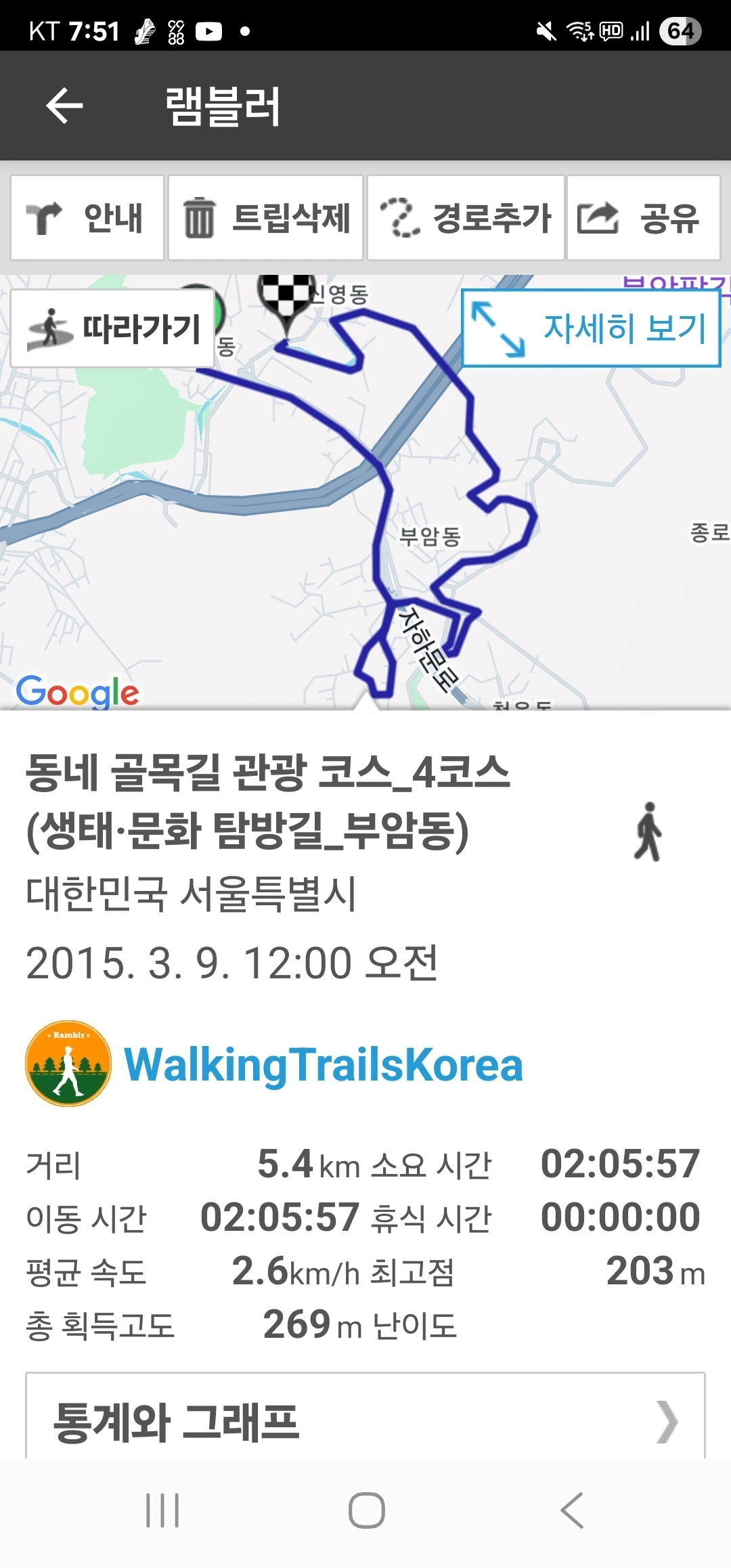 세검정 삼거리는 상명대 입구이며 부침바위가 있고 홍제천에 홍지문이 자리잡고 있다. 삼거리에서 자하터널 방향으로 세검정길을 걷기 시작하면 석파랑과 예전부터 유명했던 하림각(HW컨벤션)을 지난다. 삼계동, 석파정이 있는 서울미술관이 있고 옆 골목으로 이승만 별장이 있다. 부암동주민센터가 보이면 무계원 방향의 골목을 다시 오른다. 정면의 기차바위 그리고 돌아서면 북한산과 북악산이 보인다. 눈 앞에 보이는 한양도성은 서울에서 만나는 역사 탐방이다. 현진건 집터를 지나 반시계방향으로 가파른 골목을 오르면 목인박물관 부근이다. 이제 하산이다. 다시 부암동주민센터를 지나 창의문 방향으로 오른다. 윤동주 시인의 언덕이 있는 청운공원에는 서사정이 있다. 옆으로 인왕스카이웨이와 기차바위는 우리를 사진작가로 만든다. 삼애교회 첨탑도 잘 어울린다. 강북 도심의 풍광이 보이는 윤동주문학관 앞에서 잠시 휴식을 갖는다. 도로를 건너면 청계천발원지가 있고, 창의문으로 돌계단 몇 개를 오른다. 창의문 밑을 지나면 종종 치맥하러 찾았던 계열사가 있고, 환기미술관과 동양방앗간이 보인다. 이제 완만한 도로를 걸어 올라가면 한양도성 가는길이 보이고 저만치 산모퉁이 카페가 보인다. 말을 타고 오라는 교통 표지판을 보고 마지막 오르막을 지나면 수미정사,