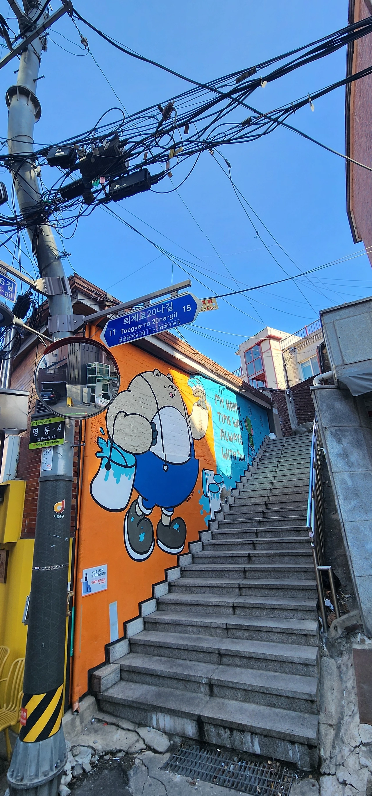 오늘 발견한 남산북측숲길은 명동역까지 최단거리를 안내한다. 북측숲길에는 중간에 3개의 전망쉼터가 있다. 시티뷰, 바닥숲, 물소리 전망쉼터다. 쉼터를 지나면 북측순환로를 만나고 제갈량을 모시는 신당인 목멱산 와룡묘를 지난다. 다시 명동역 방향으로 내려오는 계단으로 내려오면 오후 3시에도 줄이 길게 있는 돈가스 집을 지나야 한다. 명동역 부근에 이르니 골목 바닥에 재미로라 쓰여 있다. 명동역 재미로는 만화거리다. 명동역에서 길을 건너 명동골목을 걷고 오늘의 서울여행을 마무리했다.