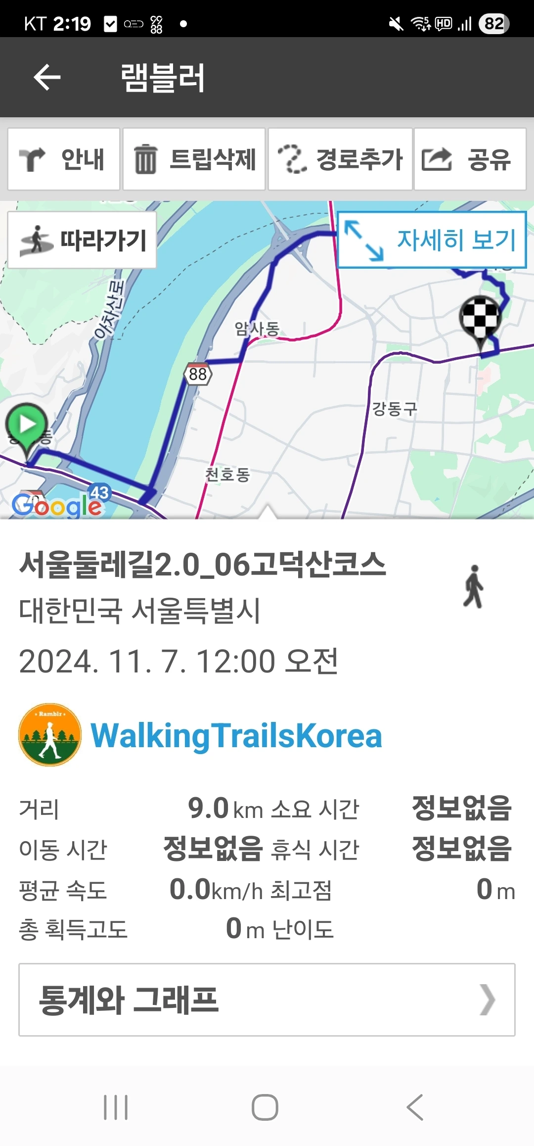 광나루역 2번 출구에서 횡단보도를 건너며 코스가 시작된다. 광장동체육공원의 조형물을 구경하고 광진교인 광나루 보행교에 도착한다. 동서방향 모두 멋진 풍광을 보여준다. 서울여행에서 만나는 작은 여유다. 광진교 8번가 안내가 있다. 다음에 들려야겠다. 광나루 ㅂ행교에서는 멀리 롯데타워 그리고 이미 기운 저녁해가 멋진 장관을 보여준다. 두 발로 걸어서 광나루 보행교를 건너면 광나루자전거공원이 기다린다. 한강 이북의 워커힐호텔을 구경하고 조금 더 걸으면 멋진 미루나무가 사진 찍으라며 유혹한다. 유혹에 몇 번 넘어가면 이제 암사나들목이 나온다. 나들목을 지나 암사동으로 들어서면 선사유적 관련된 안내가 이어진다. 선사초교도 보인다. 선사로 가는 길 그리고 선사마을 표석도 있다. 도로를 따라 걷다 보면 저만치 암사대교가 보이고 고덕산에 오른다. 갈 때마가 조금은 민망한 고덕동 고인돌을 2개나 만난다. 왜 그런지는 곡자들도 직접 찾아보길 바란다.