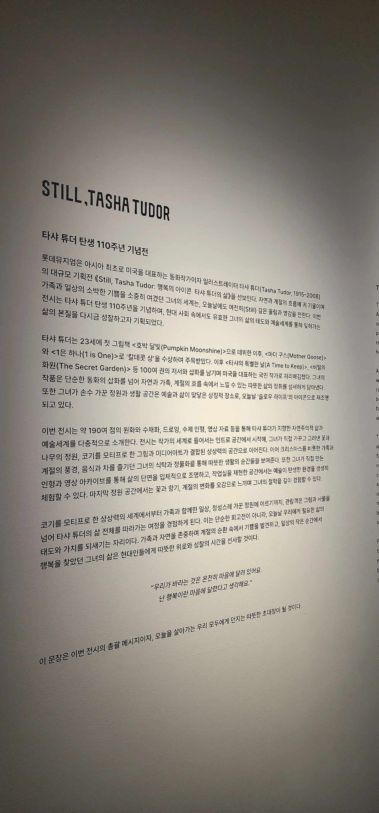 전시회는 기획전으로 아시아에서는 처음으로 작가의 탄생 110주년 기념전이라 한다. 'Still, Tasha Tudor : 행복의 아이콘, 타샤 튜더의 삶'으로 2025년 12월 11일부터 다음 주인 3월 15일까지다. 일주일 남았다. 이번 전시는 약 190여 점의 원화와 수채화, 드로잉, 수제 인형, 영상 자료 등을 통해 타샤 튜더가 지향한 자연주의적 삶과 예술세계를 다층적으로 소개한다고 한다. 편안하고 동심으로 돌아가는 시간이었다.