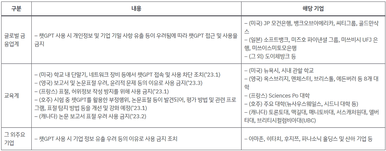 위 내용을 요약해 보면, 사용 금지 조치한 주요 사유는 '정보 유출'과 '환각 정보'입니다. 이것은 개인과 기업/학교 모두 다 해당되죠.
