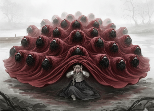 패랭이를 쓴 거구의 사내가 안개를 헤치며 나섰다. 노를 잡으려 고개를 돌린 그녀의 눈동자에는 이미 검은자위가 사라지고, 온통 시뻘건 핏빛만이 가득했다.