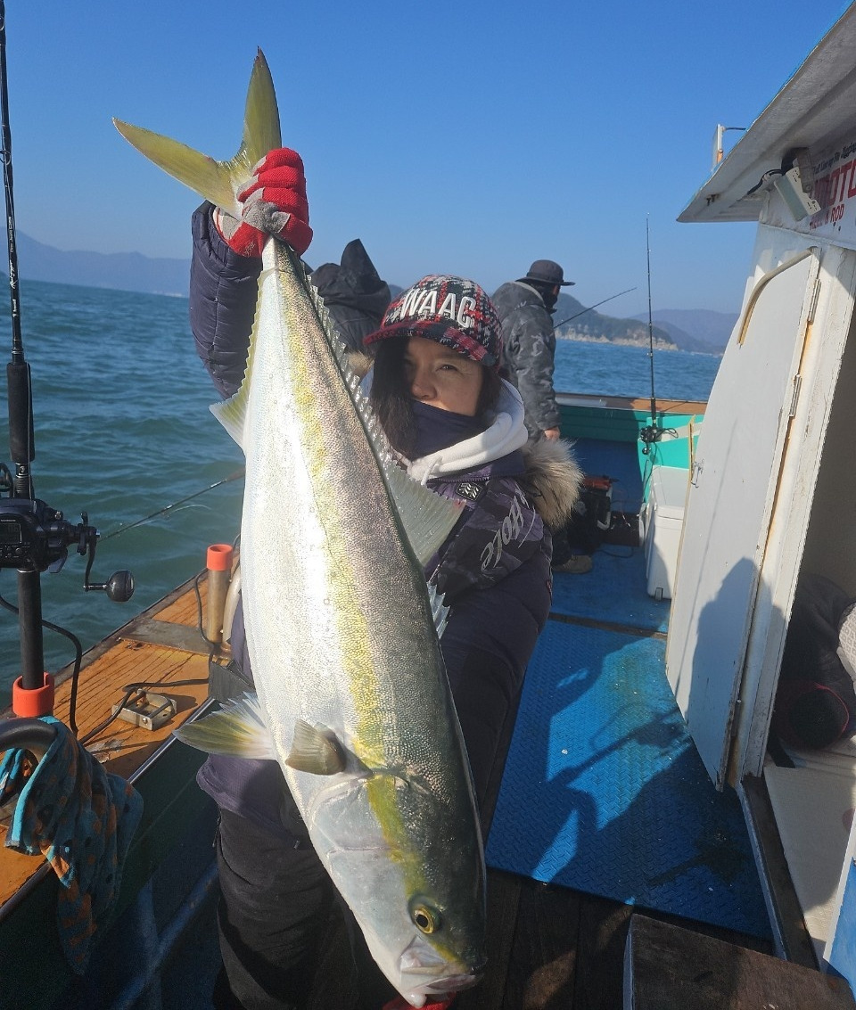 드디어 용왕님이 나한테도 대방어를 주셨다. 새해 인생 고기다. 와~우 신난다. 축하한다고 조사님들이 말씀해 주신다. 선장님이 인증사진 찍어준다. 새해 방어를 잡고 보니 왠지 2025년 좋은 일만 있을 것 같은 느낌이 왔다. 내가 장원이다.