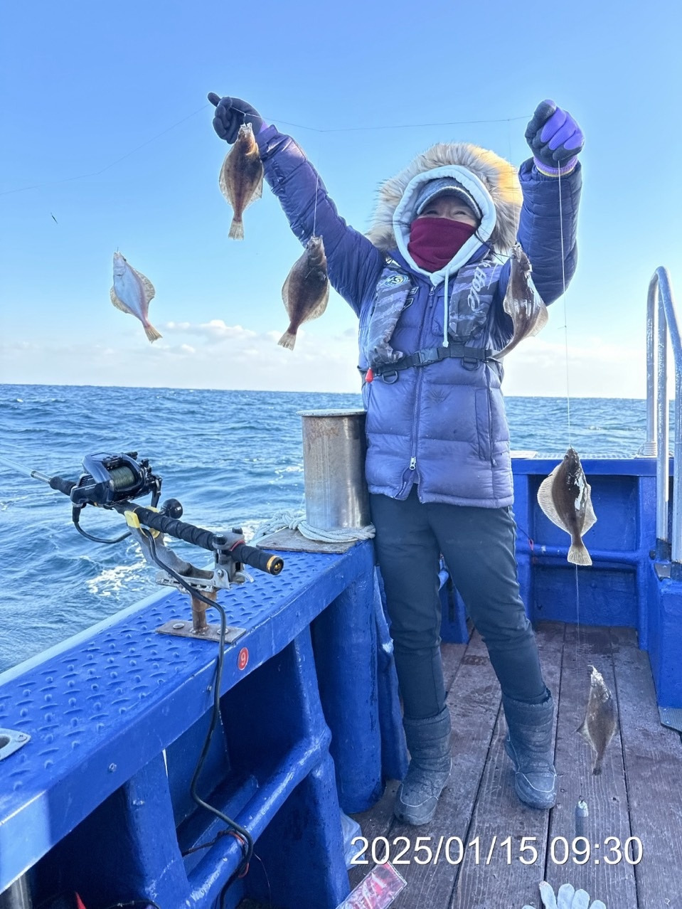 어구가자미 채비는 전동릴, 모리겐카드채비8단, 낚싯대 3m 가자미 전동대, 봉돌 100호, 갯지렁이, 모리겐카드채비 쓰면 갯지렁이 안 써도 된다. 겨울은 겨울인가 보다. 손도시리고 춥다. 파도는 하늘과 맛 닿을 것처럼 넘실거리고 이제 이골이 나서인지 뱃멀미는 안 하는데 속이 울렁거리는 듯하다. 다른 조사님은 멀미하는 듯하다. 아침 먹고 체했다 하는데 내가 보기엔 멀미다. 누워계시면 덜하니 선실로 들어가시어 누워계시라 했다. 가자미 낚싯대가 길다 보니 가자미 잡으면 연 날리는 느낌이 든다. 낚싯대가 하늘을 향해 서 있다. 잡은 가자미 역시 대롱대롱 매달려 바람에 흔들거린다.