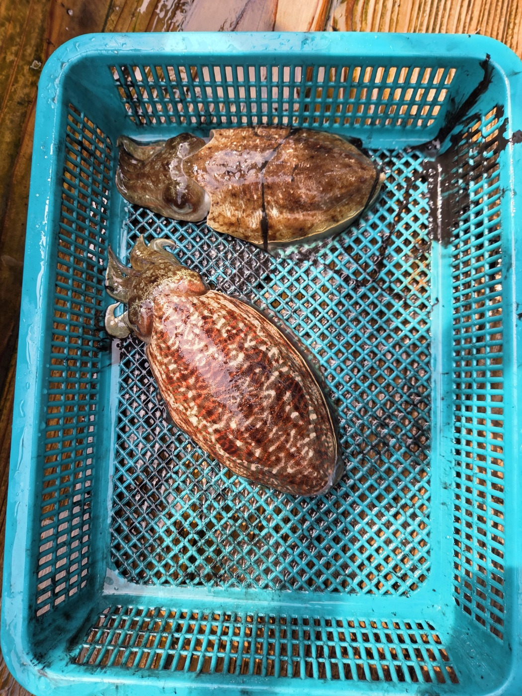 좀 있으면 산란기라 잡기도 힘들고 없다고 한다. 갑오징어는 산란하기 위해 먹이를 실컷 먹고 바닥에 붙어 있단다. 그래서 먹이 활동을 안 한단다.