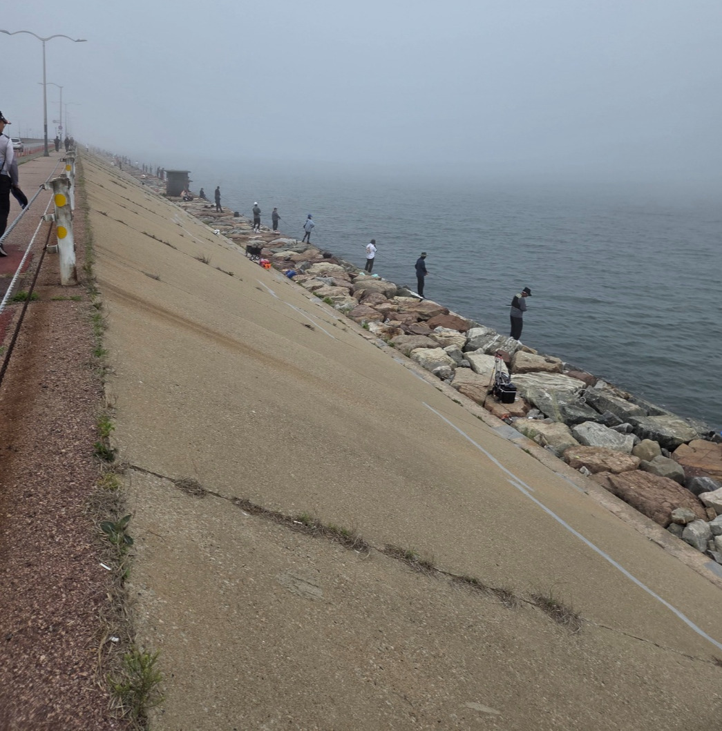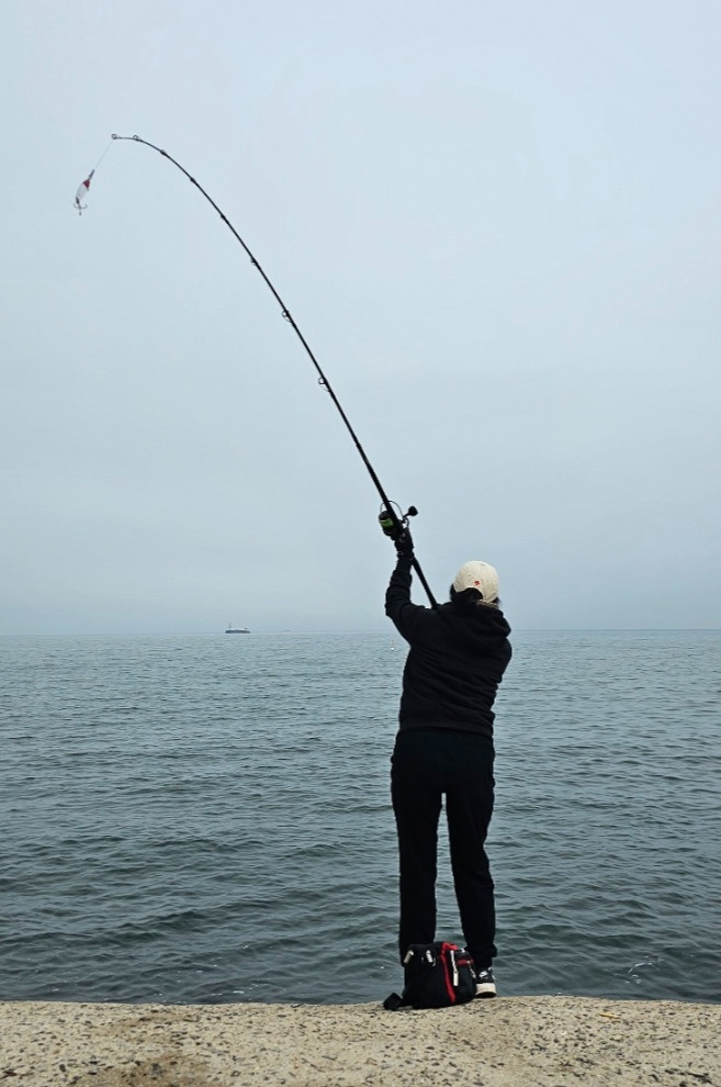 일렬로 줄을 쭈욱 서서 바다로 향해 던지고 있다. 거짓말처럼 여기로 다 모였다 해도 믿겠다. 어제는 천명 왔단다. 뭐가 나와요? 해 무가 주위를 감쌌다. 멀리서 우리 부부를 기다렸는지 지인이 알아보고 내려오란다. 방파제 아래로 내려왔다. 아무도 삼치를 잡은 사람은 없는듯하다. 소문난 잔치에 먹을 게 없듯이 소문만 무성하다. 특별히 우리처럼 바다낚시 못 가 왔겠지? 지인이 메탈지그 매달아 둔 낚시 때로 던졌다. 한두 번 던지고 말았다.
