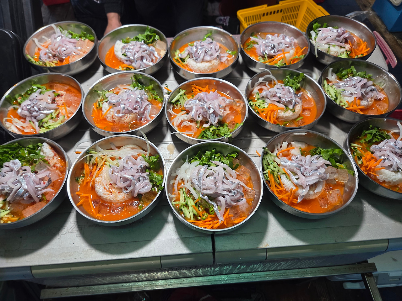 낚싯줄은 자꾸 엉켰다. 남편의 줄과 옆 조사님의 줄이 얽혀 한참을 씨름했다. 다단채비 낚시에서 줄이 걸리면 누구나 스트레스받는다. 갈치가 잘 나오지는 않는다. 그러던 중 야식 시간이 되었다. 사무장님이 각자 갈치 한 마리씩을 거두어 가더니, 즉석에서 회를 떠 물회를 내주었다. 처음 맛보는 갈치 물회. 신선하고 달콤했다. 바다의 맛이 그대로 입안을 퍼졌다.